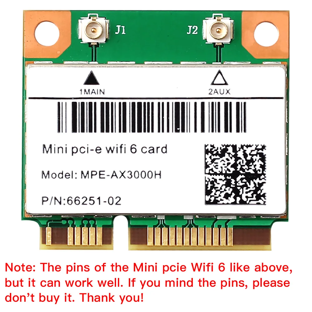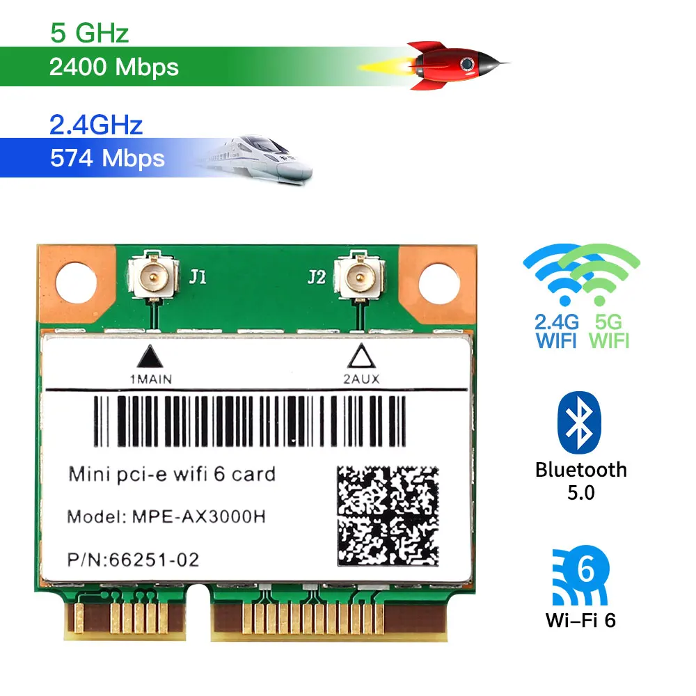 Модель: Wi-Fi 6 MPE-AX3000H; Интерфейс: Mini PCI-E; Двухдиапазонный: 2,4 ГГц/5 ГГц (160 МГц); Скорость до 2400 Мбит/с (маршрутизатор должен быть на 160 МГц)(802.11ax); Поддержка 802.11ax/ac; Поддержка Bluetooth 5,0; Поддержка MU-MIMO и OFDMA; Поддержка Windows 10 64bit/Linux;