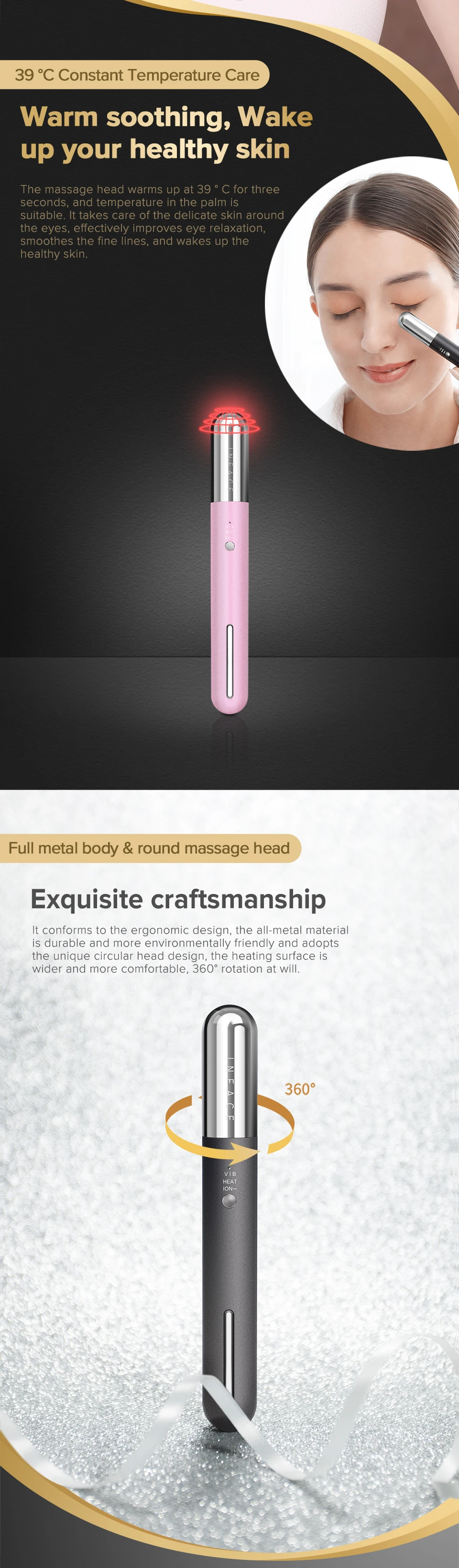 Продукт Особенности 1,10000 Гц высокочастотный Вибрационный массаж, облегчение тонких линий, снятие отечности, осветление темных кругов и Infuse эссенции. 2. Режим отрицательных ионов, питание достигает нижней части кожи. 3. 39 °C постоянный температурный уход, теплое успокаивающее, пробуждение вашей здоровой кожи. Инструкции 1. Возьмите соответствующее количество крема для глаз пальцем, размажьте его от внутреннего угла до виска и включите инструмент. 2. Медленно и мягко Используйте массажную головку для массажа от внутреннего угла глаза до виска вдоль нижнего угла глаза. 3. Делайте уход за точным нажатием, оставайтесь на 10 секунд в каждой точке и повторяйте 2-3 раза. 4. Сделайте непрерывный круг вокруг глаз, обычно 3-5 кругов. 5. Нанесите соответствующее количество средств по уходу за кожей или эссенции на лицо и включите инструмент. 6. Прикоснитесь к сенсорной панели пальцем и медленно массируйте массажную головку с лица.