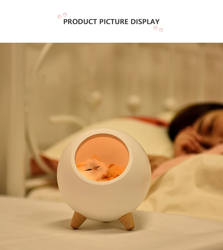 -Простой внешний вид, прекрасный питомец рядом с вами. -Бесступенчатое затемнение с сенсорным управлением, свободно регулирует яркость. -Низкое энергопотребление, usb-кабель для зарядки.