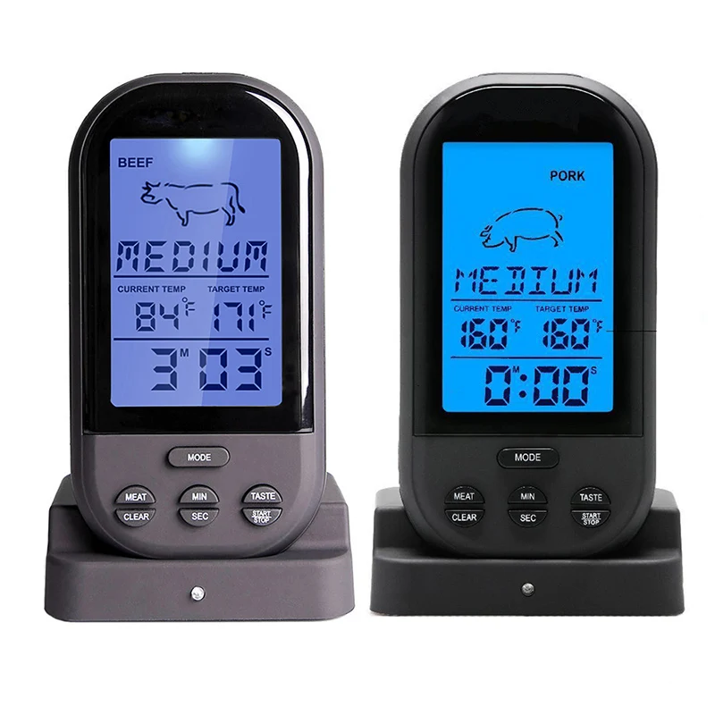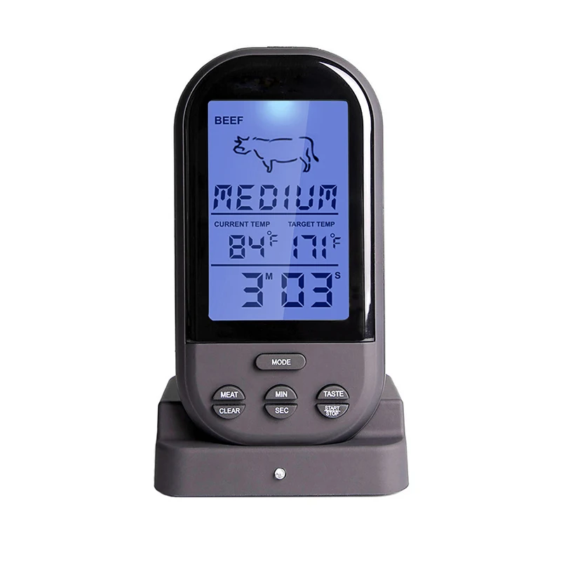 <Дальность действия: беспроводной термометр для мяса контролирует внутреннюю температуру мяса от 20 до 30 м, приемник издает сигнал, когда температура мяса достигает запрограммированной температуры.
