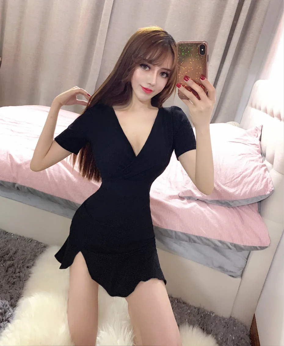 Женское облегающее мини-платье с высокой талией черное платье V-образным вырезом