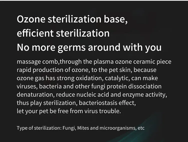 ● Основа для стерилизации озона эффективная Стерилизация: Массажная расческа может быстро генерировать озон через керамический лист плазменного озона и достигать кожи питомца. Из-за сильного окисления и катализа озонового газа, он может разъединить и разгрузить грибковые белки, такие как вирусные и бактерии, уменьшить активность нуклеиновых кислот и ферментов, И, таким образом, он имеет бактерицидный эффект и имеет бактериостатический эффект, так что ваш питомец может избавиться от этой инфекции.