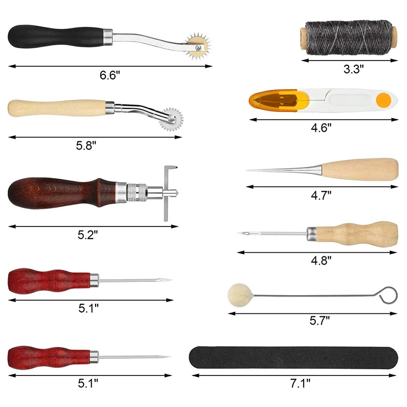 Прочный: весь набор кожаных швейных инструментов изготовлен из стали и дерева, который, безусловно, не легко сломать и прочный. Различные типы конусов используется для отверстий, удаления игл, нитей и т. д.