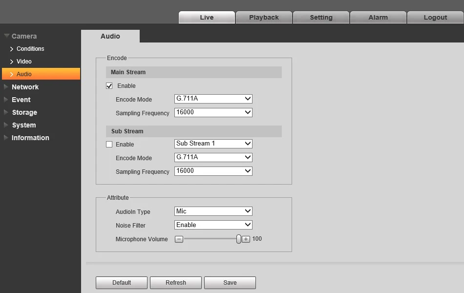 Compression : G.711a/G.711Mu/AAC/G.726