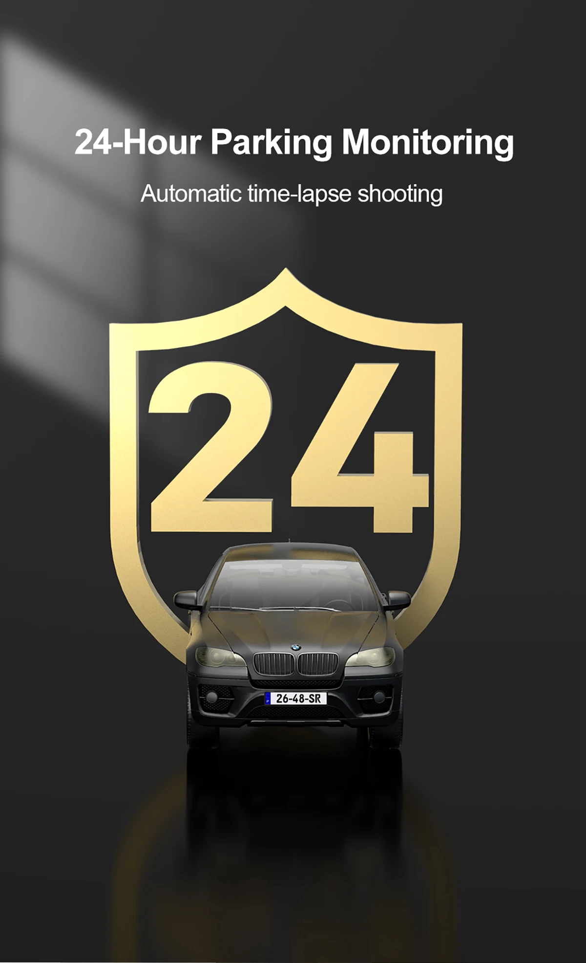 При вводе 24 часа мониторинг парковки, камера Dashcam покадровой функция записи начнет автоматически, Кол-во съемки кадров сократилась с 30 кадров в секунду, чтобы 1 кадра в секунду.