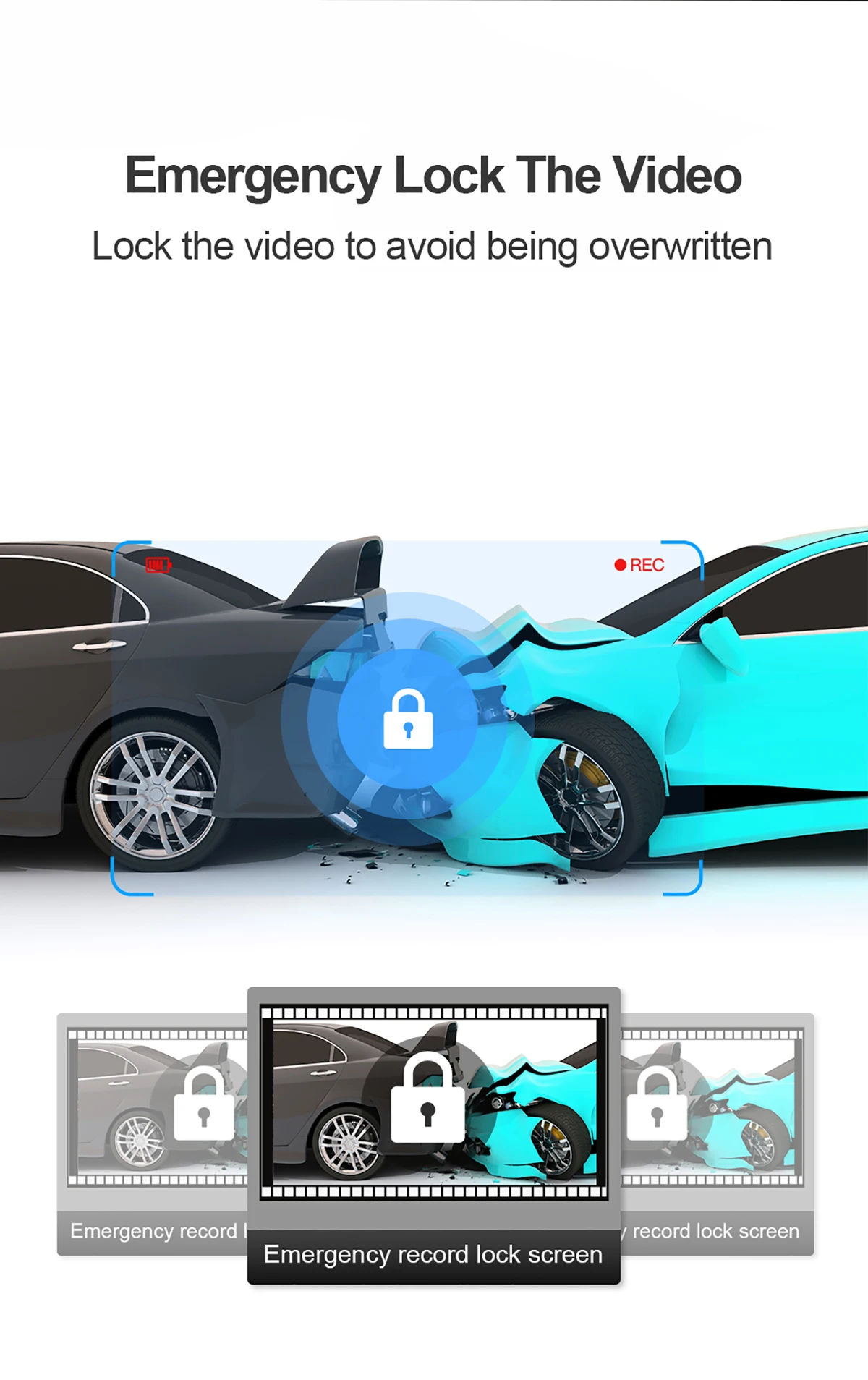 Не волнуйтесь, что циклическая запись перезаписывает видеоданные аварии и не может быть использована для сбора доказательства. После аварийной ситуации g-датчик автоматически войдет в аварийное положение, заблокирует видеоэкран и сохранит его отдельно без перезаписи.