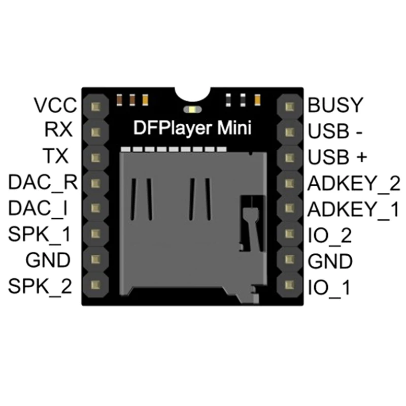 DFPlayer Mini-Компактный и недорогой MP3-модуль, который можно подключить напрямую к динамику. Модуль с блоком питания от батареи, динамиком, клавиатурой можно использовать отдельно или через управление последовательным портом, как для Arduino UNO или любого микроконтроллера с модулем последовательного порта. Сам модуль прекрасно интегрирован в аппаратное декодирование MP3, WAV, WMA. В то время как программное обеспечение поддерживает драйвер карты TF для поддержки FAT16, FAT32. Может быть сделано с помощью простой последовательной команды воспроизводит заданную музыку, а также как воспроизводить музыку и другие функции, без утомительного низкого уровня, простой в использовании, стабильный и надежный.