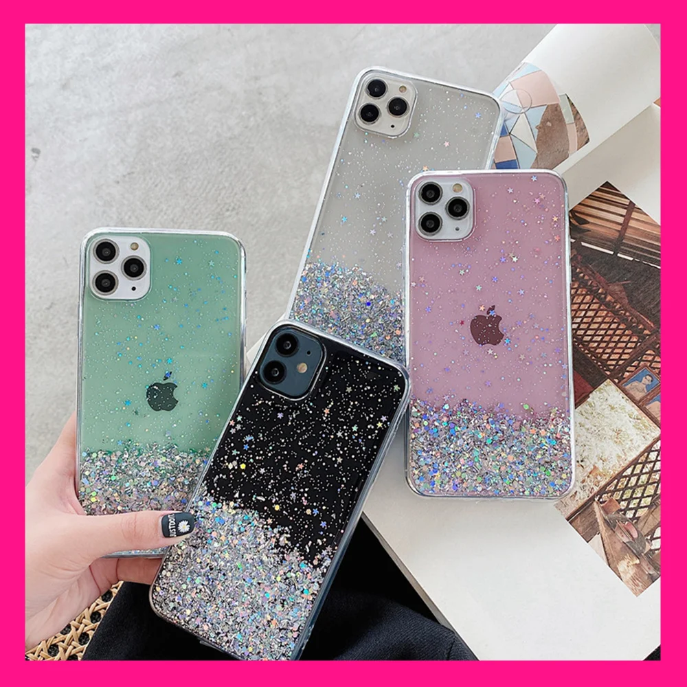 Glitter Phone Case For iPhone SE 2020 11Pro Xs MAX XR X 7 8 Plus Luxury Star Bling Glow Color Transparent Shockproof Epoxy Cover