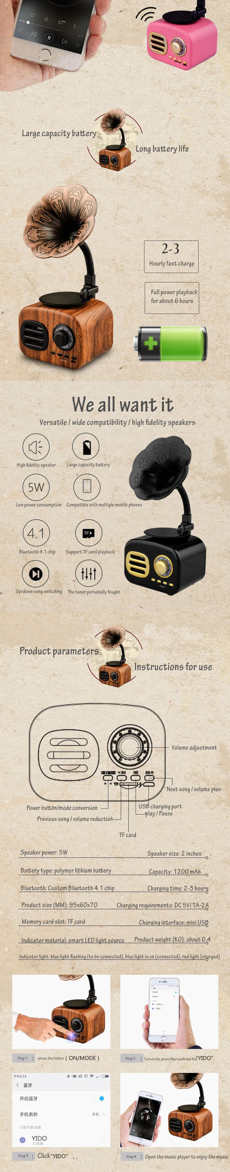 Особенности: Полнодиапазонный динамик, высокий-средний-низкий трехполосный охват, мощное качество звука, сохраняя оригинальный хороший звук. С модулем Bluetooth 4,1, он быстрый и простой в использовании, стабильный, удобный и энергосберегающий. Различные совместимые, удобные соединения, 10 метров эффективное расстояние. Быстрая зарядка в течение 2-3 часов, непрерывное воспроизведение около 6 часов. Ответ при нажатии на кнопку, телефонная связь очень удобна, и динамик снижен. Светильник индикатора: синий светильник, мигающий (должен быть подключен), синий светильник (подключен), Красный светильник (зарядка). Описание: При вставке tf-карты динамик автоматически распознает содержимое. Когда аудиокарта преобразуется в режим Bluetooth, tf-карта может быть вытянута. Технические характеристики: Интерфейс Тип: USB Емкость аккумулятора: 1200 мАч Частотный диапазон отклика: 100 Гц-20 кГц Выходная мощность: 5 Вт Отношение сигнал-шум ≥ 70db