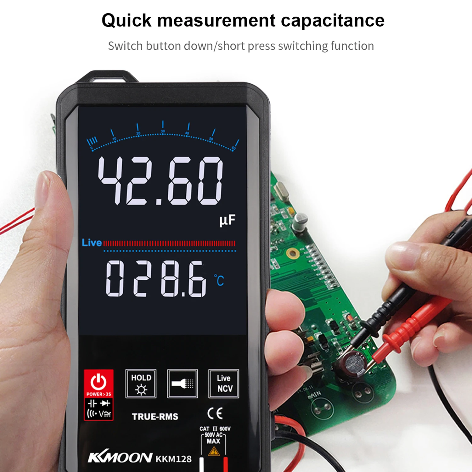 Функция: тест на напряжение, тест на емкость, тест на сопротивление, диодный тест, распознавание пожарного провода, фонарик, электрическое поле, звуковой сигнал, истинное RMS, автоматическое отключение, хранение данных.