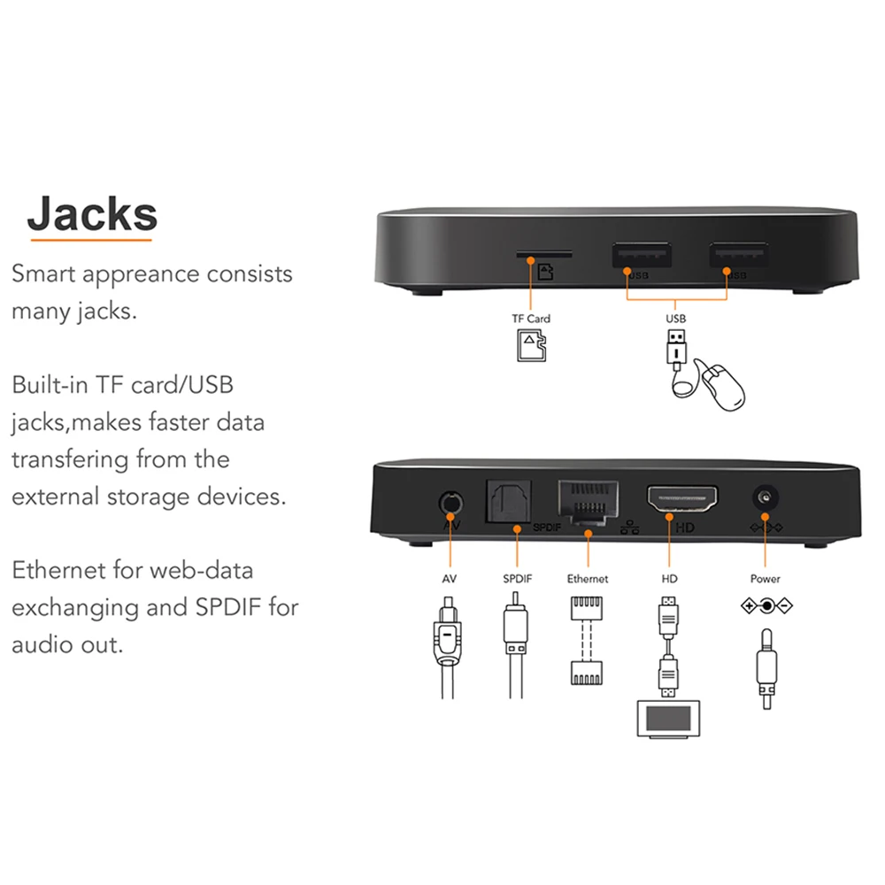 Интерфейс ввода/вывода: 1 * HD порт, 2 * USB порт, 1 * AV порт, 1 * TF слот для карт, 1 * RJ45, 1 * SPDIF порт, 1 * вход питания (5 В/2 а)