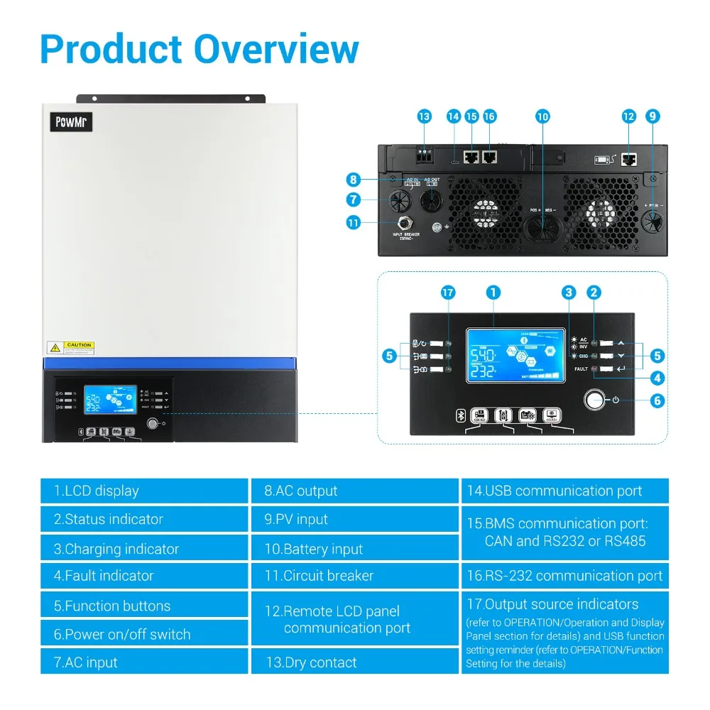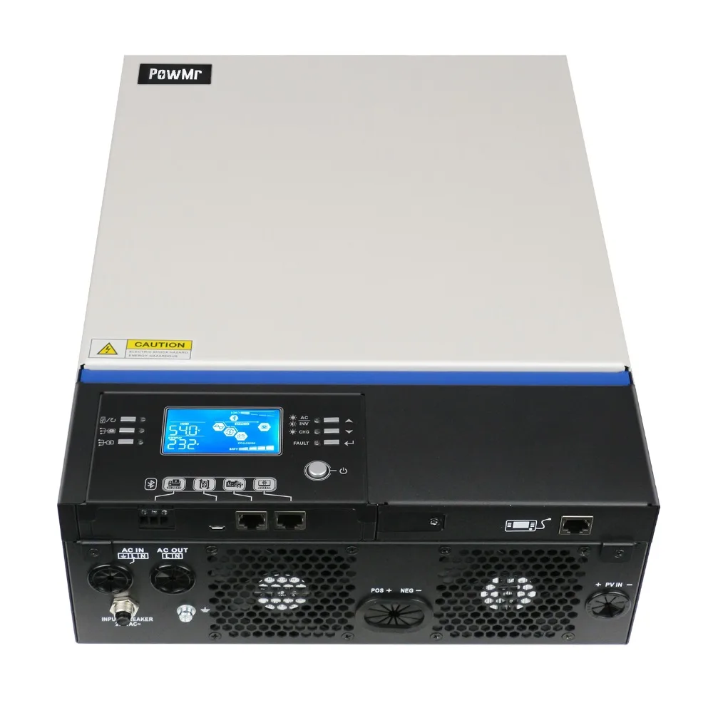 Это многофункциональный инвертор/зарядное устройство, сочетающее функции инвертора, солнечного зарядного устройства и зарядного устройства для обеспечения бесперебойного питания с портативным размером. Его Полный ЖК-дисплей предлагает настраиваемое и легкое управление кнопками, такими как ток зарядки аккумулятора, приоритет переменного/солнечного зарядного устройства и приемлемое входное напряжение на основе различных приложений