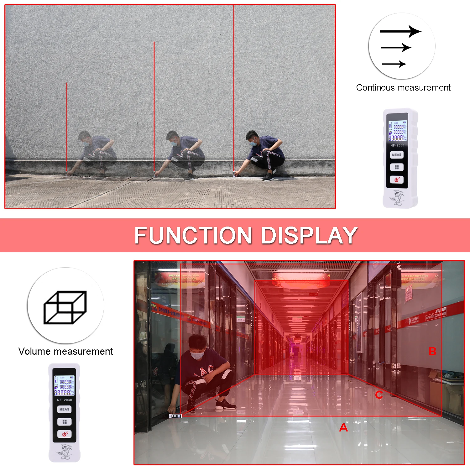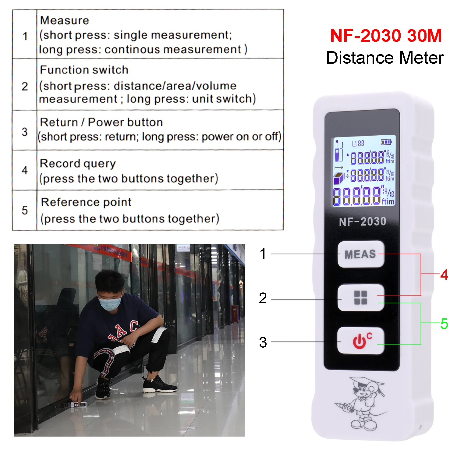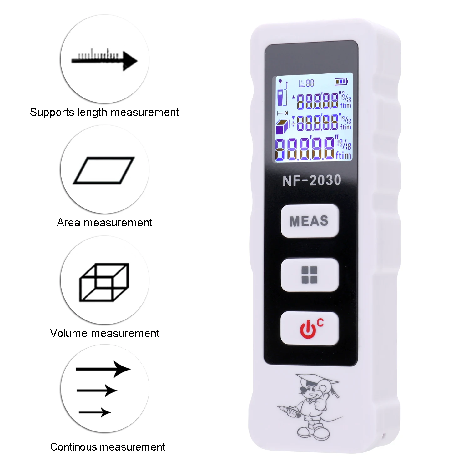 Это устройство предназначено для измерения расстояния, площади, объема, который в основном применяется для внутренней отделки и проектирования, строительства зданий. Полностью оснащен 4 режимами измерения, одиночным режимом измерения, непрерывным режимом измерения, режимом измерения площади, режимом измерения громкости. Вы можете попробовать.