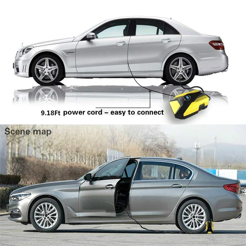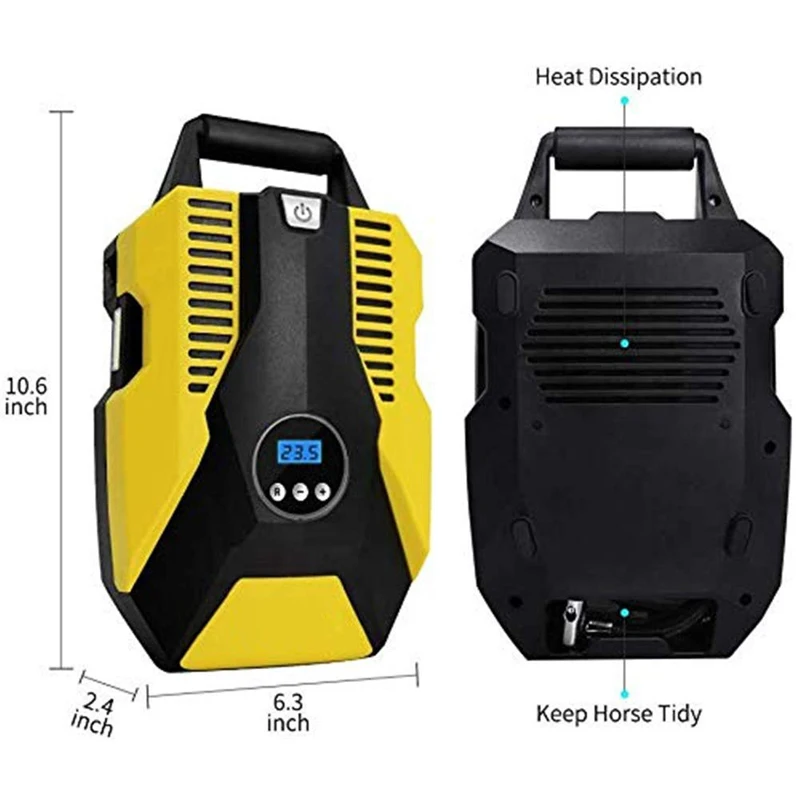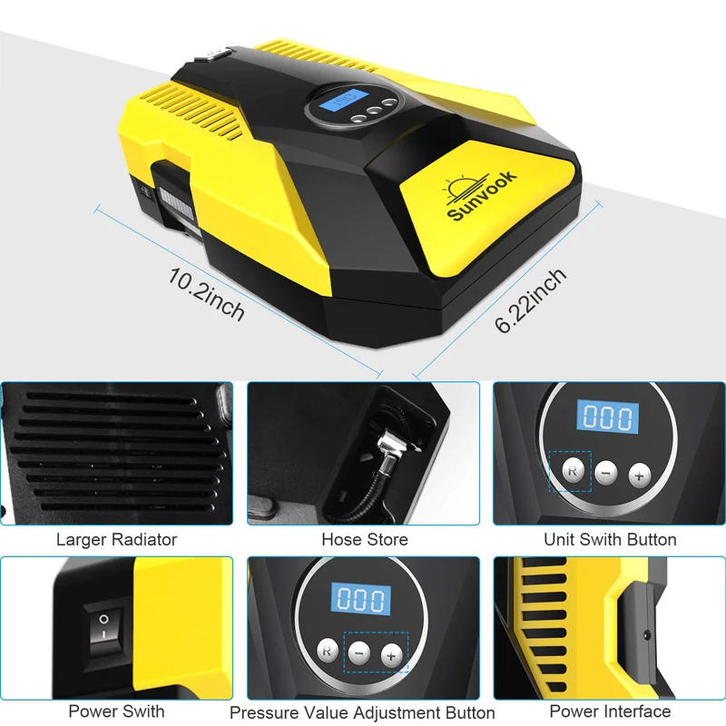 [Максимальное рабочее давление 150psi] портативный воздушный компрессор 12 В постоянного тока с цифровым манометром имеет максимальное рабочее давление 150psi. Подключите непосредственно к прикуривателю вашего автомобиля. Насос для шин работает быстро и точно. Он автоматически отключится, когда достигнет желаемого давления в шинах. Защита от перегрева автоматически отключается при перегрузке. Двигатель высокой мощности 120 Вт обеспечивает сверхвысокую скорость надувания [Многократного использования] портативный воздушный компрессор насос поставляется с 9.18ft (2,8 метров) длинный шнур питания и надувной адаптеры (3 дополнительных насадок), удобное подключение к передние и задние колеса. Идеальный воздушный компрессор насос для автомобилей, некоторых небольших грузовиков, мотоциклов, велосипедов, внедорожников, надувных лодок, спортивных мячей, воздушного матраса и других надувных изделий [Легко установить датчик давления в шинах] Накачка шин оснащена точным и ярким цифровым индикатором давления в шинах, который поможет вам рассчитать необходимые значения. Вы можете установить давление в шинах. Нажмите R, чтобы переключить устройство, нажмите + или-для увеличения или уменьшения значений. Включите переключатель автомобильного воздушного насоса для работы через несколько секунд после того, как значение цифры прекратит мигать [Яркий светодиодный фонарик] 12 В постоянного тока воздушный компрессор шины надувные имеет встроенный светодиодный фонарик, который является ярким и долговечным, позволяет легко получить доступ и удобно использовать в ночное время. Светодиодный светильник позволяет видеть в темноте, чтобы избежать любых возможных опасностей во время эксплуатации. Шиномонтажный насос имеет заднее отверстие, которое предназначено для уменьшения тепла воздушного компрессора [Защита безопасности и отличный сервис] насос для шин разработан с защитой от перегрева для большей гарантии безопасности. Если у вас есть какие-либо проблемы, пожалуйста, свяжитесь с нами. Это очень безопасный компактный портативный воздушный компрессор с ручкой для вас. Я могу легко использовать его для четырех шин спереди и сзади. Он имеет цифровой датчик давления в шинах и позволяет мне задать желаемое давление в шинах. Максимальное рабочее давление 150psi. Подключите непосредственно к прикуривателю автомобиля. Защита от перегрева автоматически отключается при перегрузке. Он также имеет встроенный СВЕТОДИОДНЫЙ фонарь для удобного использования в ночное время. Шиномонтажный насос имеет заднее отверстие, которое предназначено для уменьшения тепла воздушного компрессора. Параметры Рабочий ток: ≤ 12А Название продукта: автомобильный воздушный насос Мощность: напряжение транспортного средства Номинальное напряжение: DC12V Номинальное напряжение: цифровой дисплей (с предустановкой) Температура окружающей среды: -20 ~ 60 ° Размер продукта: 26,5 × 8.7x16cm Длина шнура питания: около 290 см Время автономной работы: 10 мин Вес: около 0,84 кг Дисплей: PSI / BAR / KPA / KGF Длина надувной трубки: около 55 см Посылка в том числе 1 * воздушный компрессор 1 * иглы 1 * трубка подачи воздуха