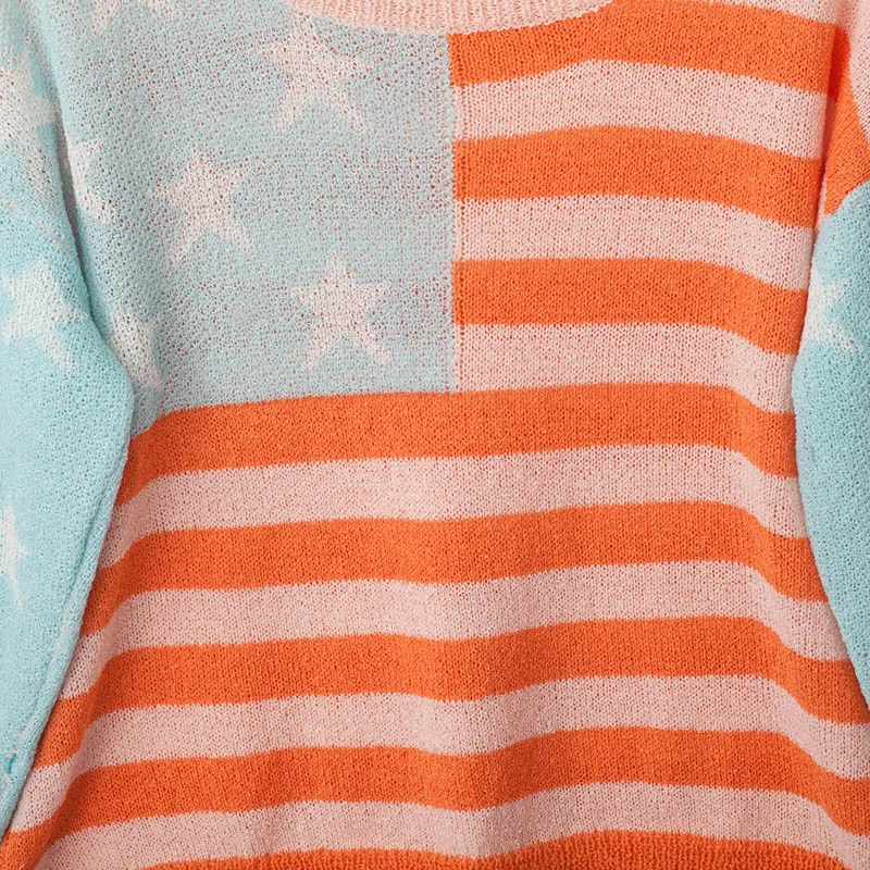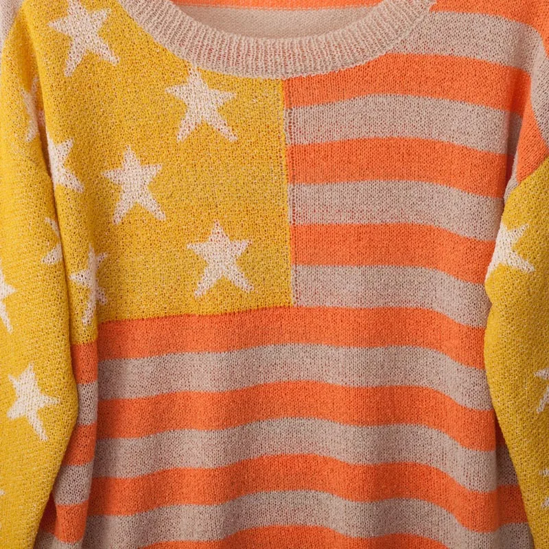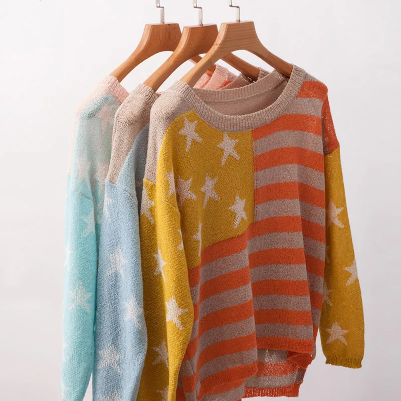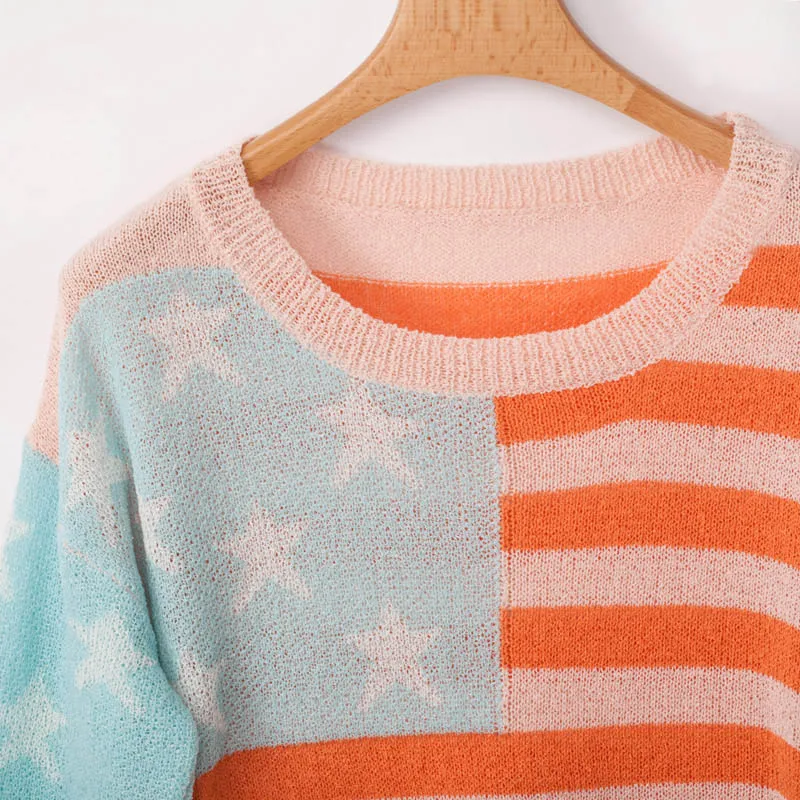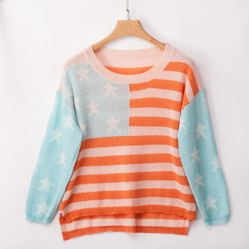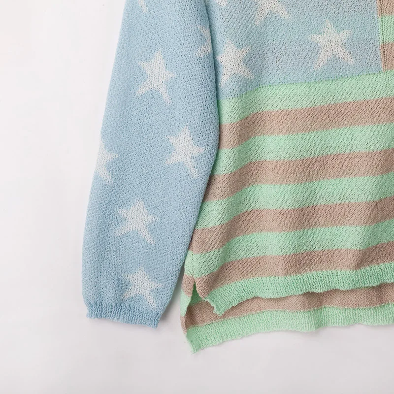 New Arrival Womens Long Sleeved Stars Stripes Sweater Color Matching Casual Pullover Sweater