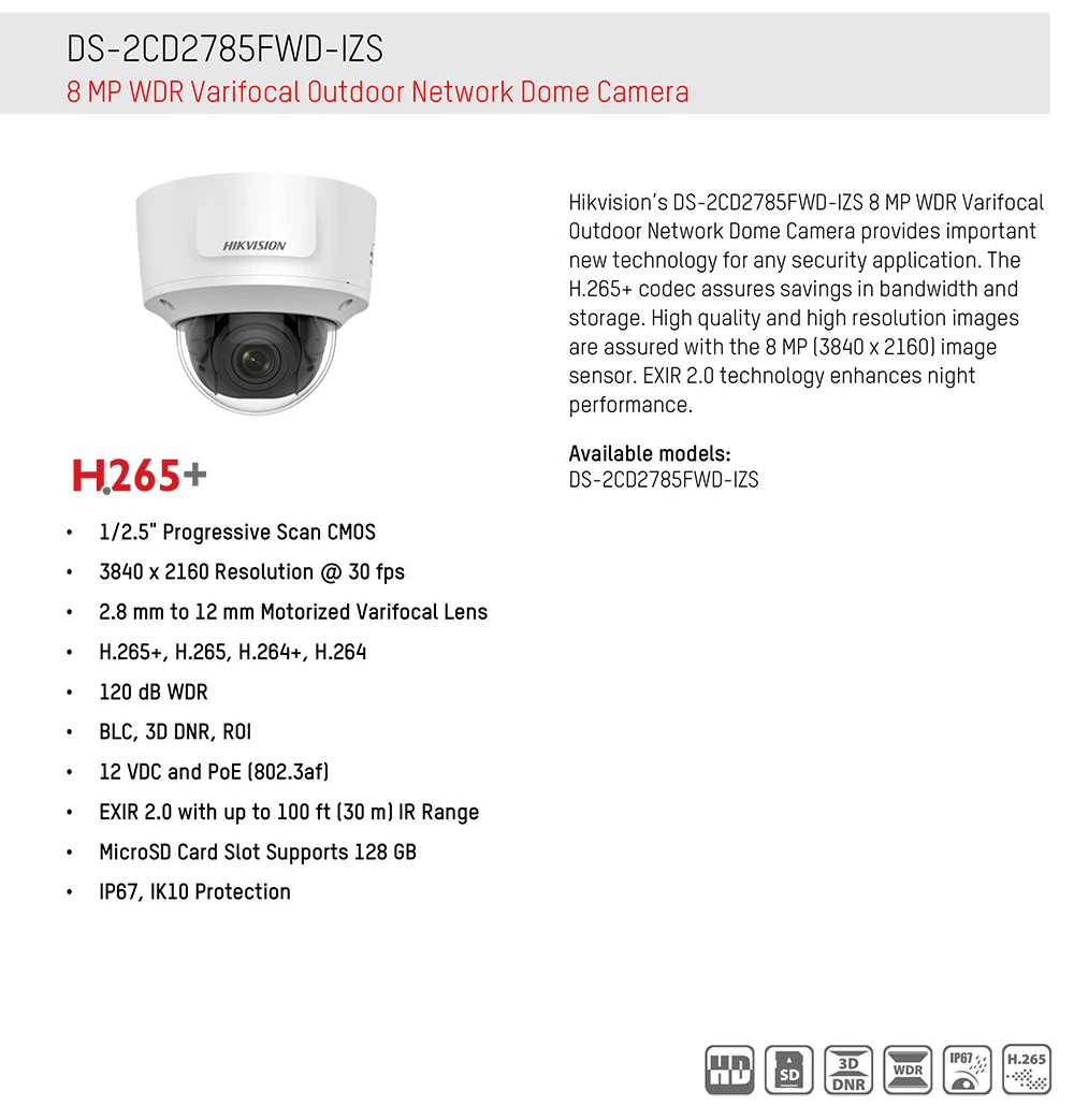 Минимальная освещенность: Цвет: 0,01 Люкс @ (F1.2, AGC ON), 0 Люкс с ИК; Цвет: 0,014 lux @ (F1.4, AGC ON), 0 Люкс с ИК Разрешение 3840x2160 @ 30 кадров в секунду Фокусное расстояние: 2,8 до 12 мм H.265 +, H.265, H.264 +, H.264 Основной поток: 20 кадров в секунду (3840 × 2160), 30 кадров в секунду (2944 × 1656, 2560 × 1440, 1920 × 1080, 1280 × 720) EXIR 2,0 с ИК-диапазоном до 100 футов (30 м) 12 В постоянного тока и PoE (802.3af)