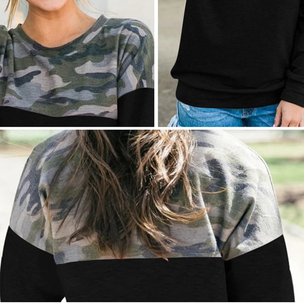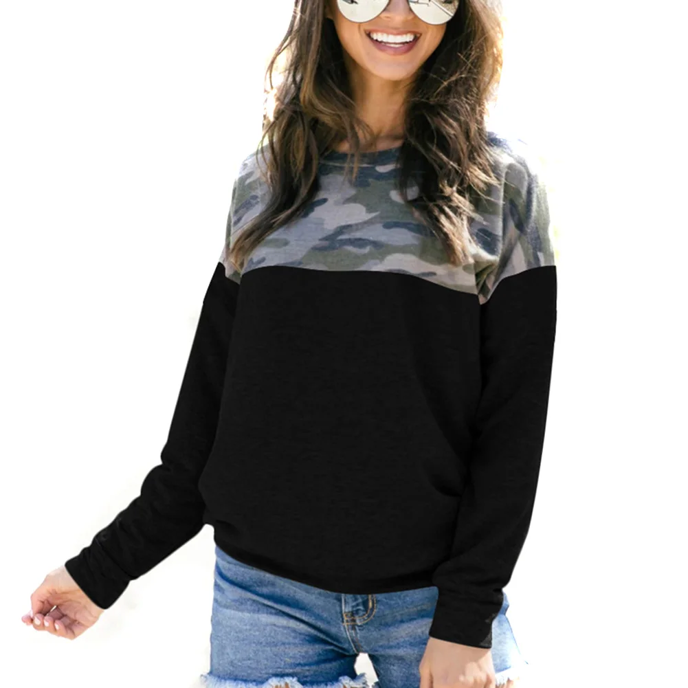 Новое поступление, женская футболка с длинным рукавом и круглым воротником, камуфляжная футболка с принтом, топ на осень