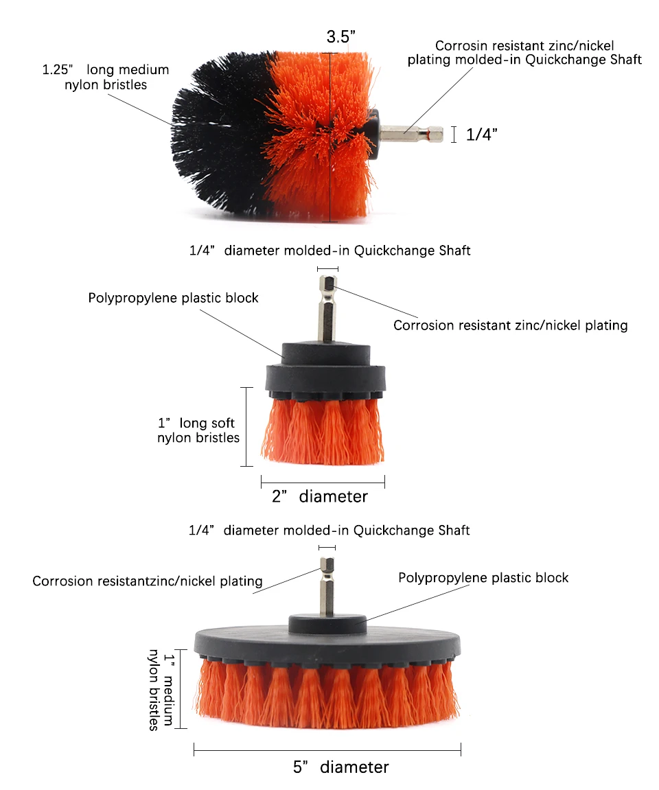 This kit contains medium stiffness nylon power brushes that will attach to your favorite cordless drill