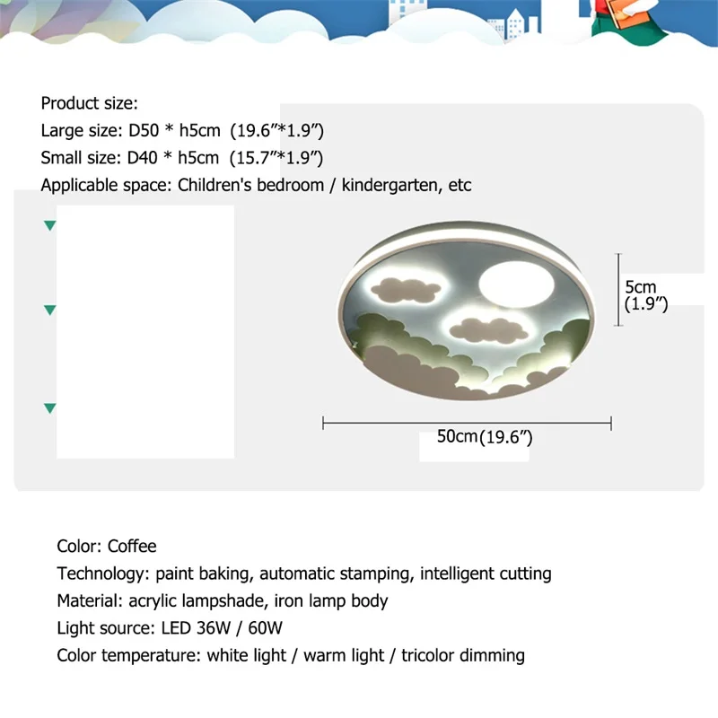 Название продукта: детский потолочный светильник Стиль: Современный модный современный новый дизайн декоративный Напряжение: 220 В-240 В/110 В-120 в Источник освещения светодиодный Ной лампой Размер: S/L Цветовая температура: A, светильник B, 3 цвета светильник, теплсветильник, нейтральсветильник) Применимое пространство: детская комната, детская комната, детский сад и т. д. Гарантия: 3 года Упаковка: 1 комплект