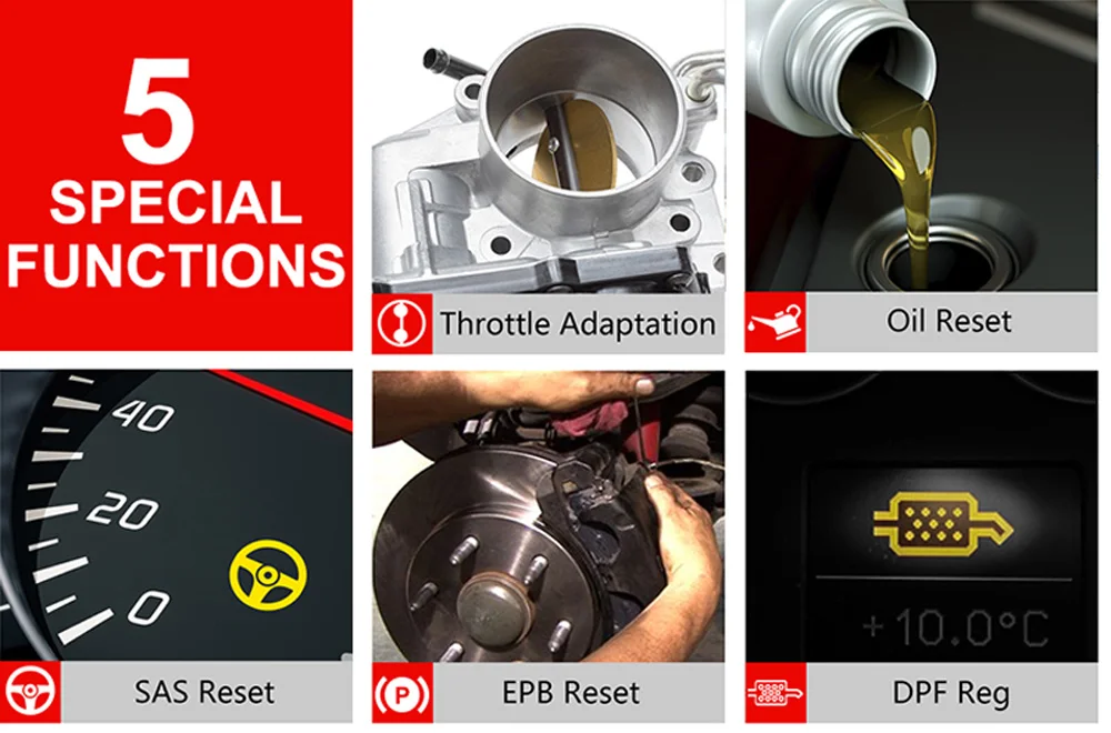 Сброс масляной лампы-Выполните сброс для системы эксплуатации моторного масла, которая вычисляет оптимальный интервал изменения срока службы масла в зависимости от условий вождения автомобиля и климата. Сброс EPB-безопасно и эффективно поддерживать электронную тормозную систему, деактивируя и активируя тормозную систему управления, устанавливая тормоза после замены диска или колодки и т. д. ETS Reset-оцените электронную систему дроссельной заслонки, Контролируйте ток и напряжение замыкания и активируйте сброс после демонтажа, замены или очистки дроссельной заслонки. SAS Reset-выполнение калибровки датчика угла поворота руля, который постоянно хранит текущее положение руля как прямое положение вперед в сенсоре EEPROM. Регенерация DPF-управление регенерацией DPF, замена компонентов DPF после замены блока управления двигателем.