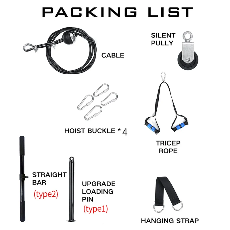 Включает в себя 78,74 дюймовый высокопрочный обшитый кабель для поддержания прочности, долговечности и плавной работы. Бесшумный кабельный шкив изготовлен из специальной сверхпрочной стали, обеспечивает отсутствие дополнительного шума во время работы. Модернизированный стальной загрузочный штифт, максимальная нагрузка до 300 фунтов.