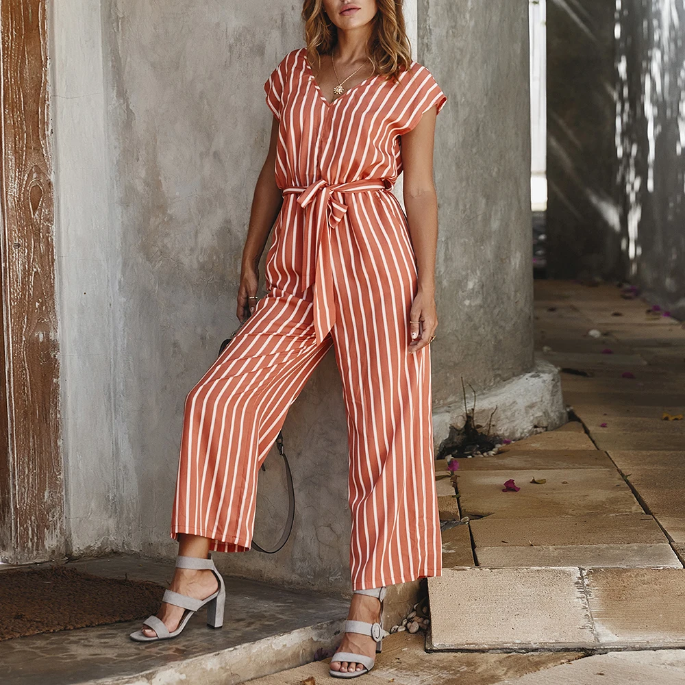 -Повседневный комбинезон в полоску с v-образным вырезом и короткими рукавами; Сезон весна-лето