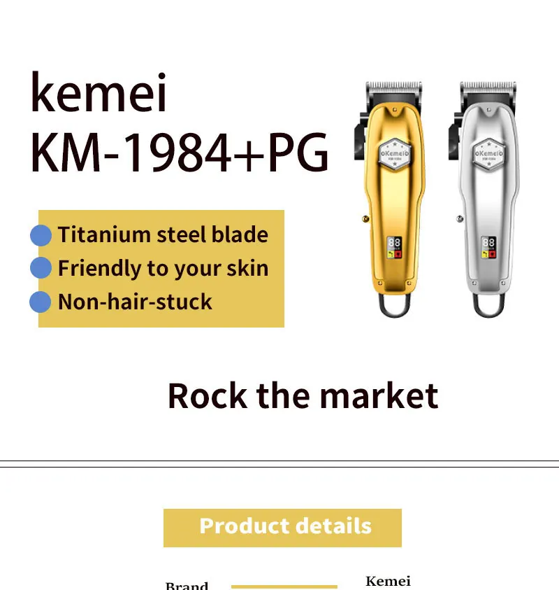 Подробнее о продукте: продукт: перезаряжаемая машинка для стрижки модель: KM-1984PG мощность: 5 Вт Входное напряжение: Универсальное Время зарядки: 3 часа Время использования: 180 мин Цвет: Золотой Вес: около 230 г Батарея: 2200 мА · ч Зарядка: usb ограничитель заряда: 3/6/9/12 мм Особенности: Мощный мощный долговечный мотор, внимательный и цифровой, умный, энергетический, usb зарядка, один внутренний, экологически чистый аккумулятор, острая и долговечная возможность работы в течение 3 часов после полной зарядки интеллектуального управления чипом хоста и защиты для блока питания комплектация: 1 * машина 1 * Зарядное устройство USB 4 * Концевая расческа 1 * щетка 1 * чистящая щетка 1 * Руководство Hello покупателей, 1) масляная бутылка не будет включена, Это из-за ограничений воздушной доставки, масло не безопасно для воздушной доставки, судоходная компания не позволяет нам отправлять масло, пожалуйста, поймите нас, большое спасибо.