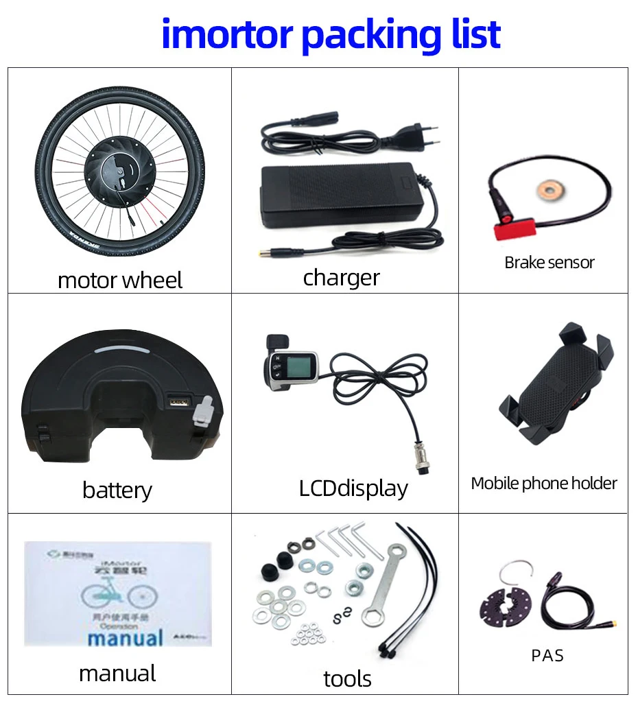 IMortor 3,0 комплект для переоборудования электрического велосипеда может преобразовать ваш обычный велосипед в электрический велосипед, включая литиевую батарею 36V 7.2Ah, колесо iMotor 36V 350W может подходящий диск тормоза и тормоза V, длина передней вилки 100-105 мм, максимальная скорость около 45 км/ч, может работать около 45 км, есть две версии типа: A: Дисплей версия B: полная беспроводная версия приложения) IMortor 2,0 комплект для переоборудования электрического велосипеда может преобразовать ваш обычный велосипед в электрический велосипед, включая литиевую батарею 36V 3.2Ah, колесо iMotor 36V 240W может подходящий диск тормоза и тормоза V, длина передней вилки 100-105 мм, максимальная скорость около 30-50 км/ч, с PAS может работать около 30-50 км