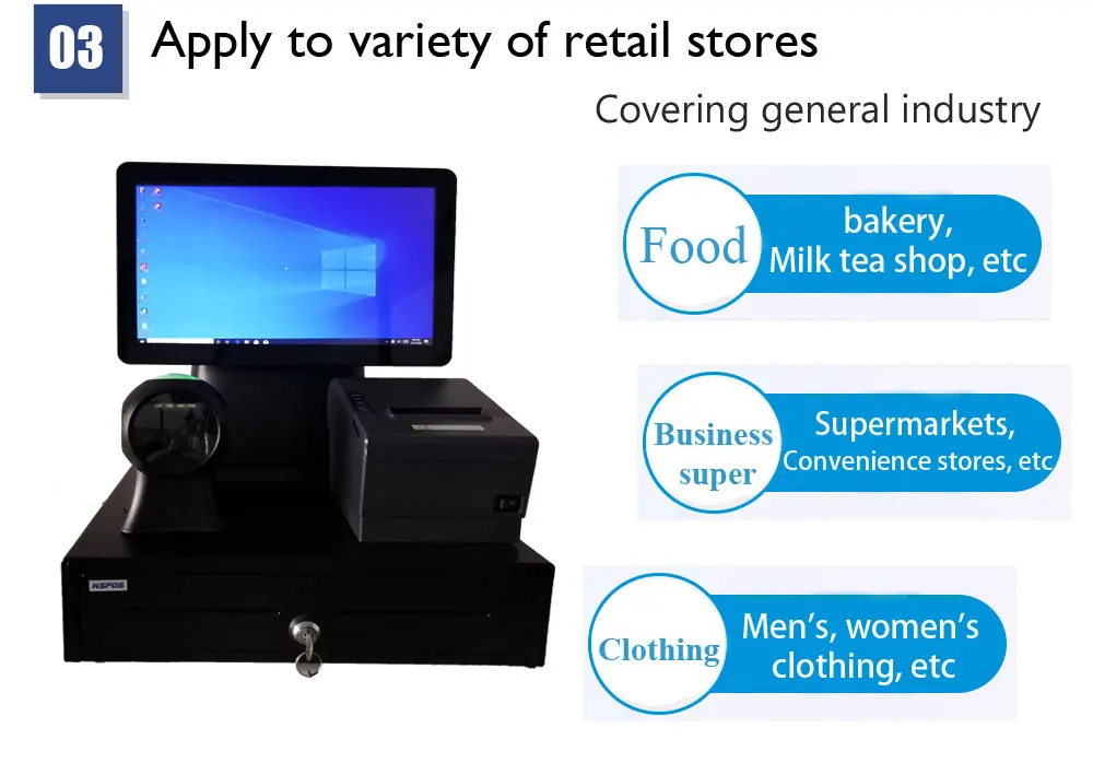* 15,6 дюймов светодиодный Дисплей protect waterproff защита от пыли емкостный сенсорный экран * 80 мм термопринтер с резцом * 2D сканер штрих-кода * С системой Winows 10 * Withwifi интерфейс * С Касса * Поддержка для запуска любого restarant Softeare * Работает быстро, стабильно, долговечно * Высокое качество ABS усиленные витрины