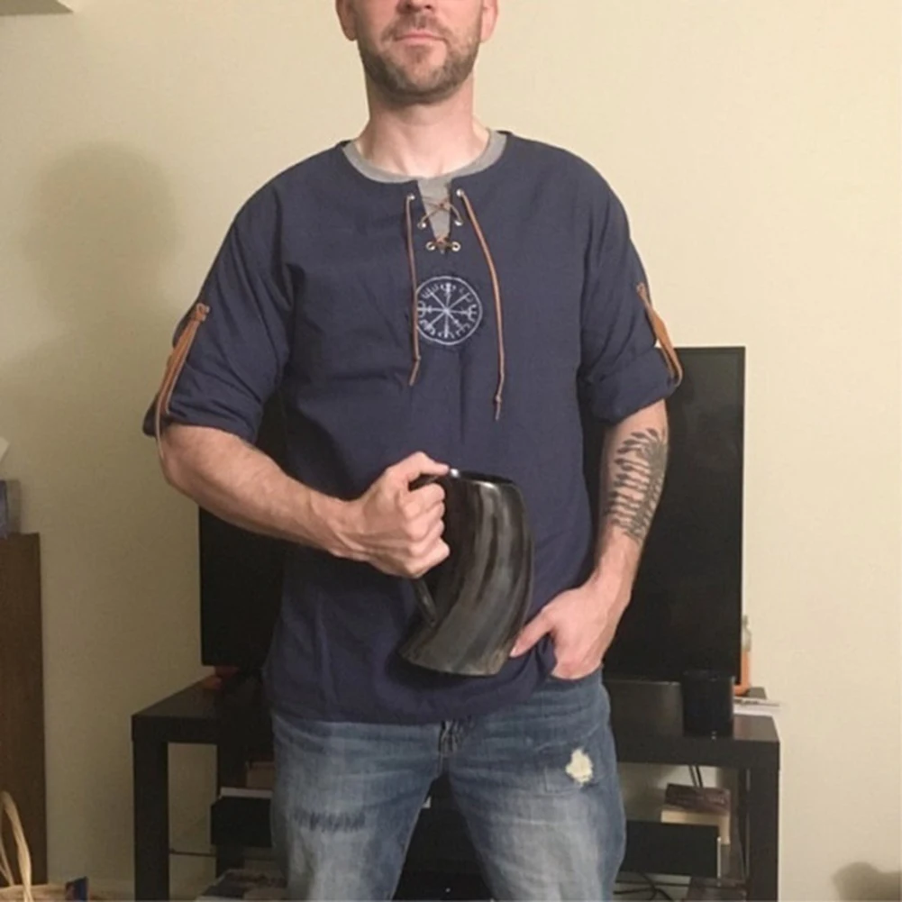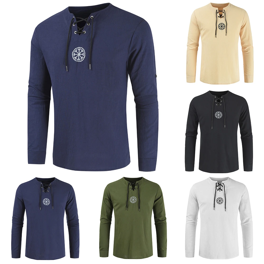 Мужская рубашка размера плюс, топ с вышивкой древнего Викинга, на шнуровке, с v-образным вырезом, с длинным рукавом, топ для мужской одежды