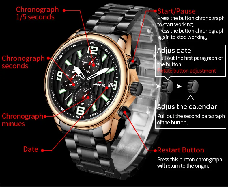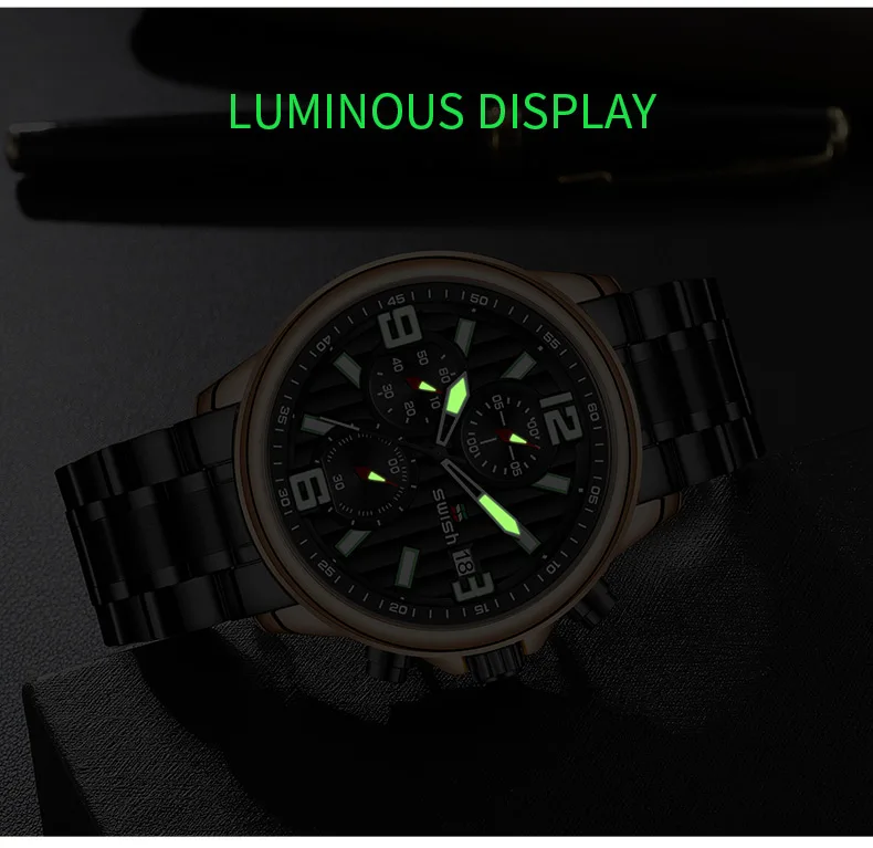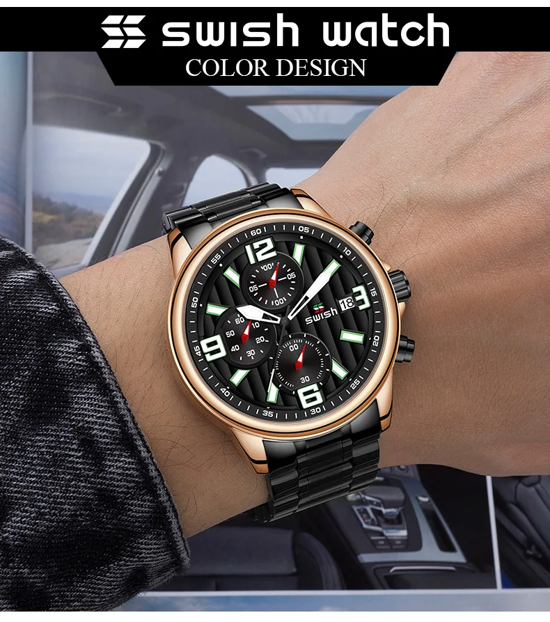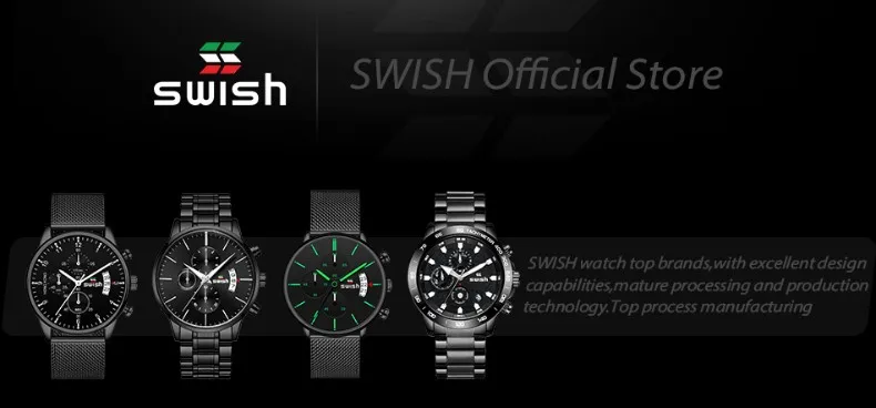 Бренд: SWISH Стиль: Повседневный, модный, деловой, спортивный Механизм: оригинальный кварцевый механизм Основная особенность * 100% новые и высококачественные ** 3 АТМ/30 М Водонепроницаемость (поддержка холодного душа и плавания, не используйте часы под водой, не поддерживайте горячую воду); *** Чехол из сплава; *** Качественная нержавеющая сталь 1 * набор = 1 * SWISH Watch + 1 * Подарочная коробка