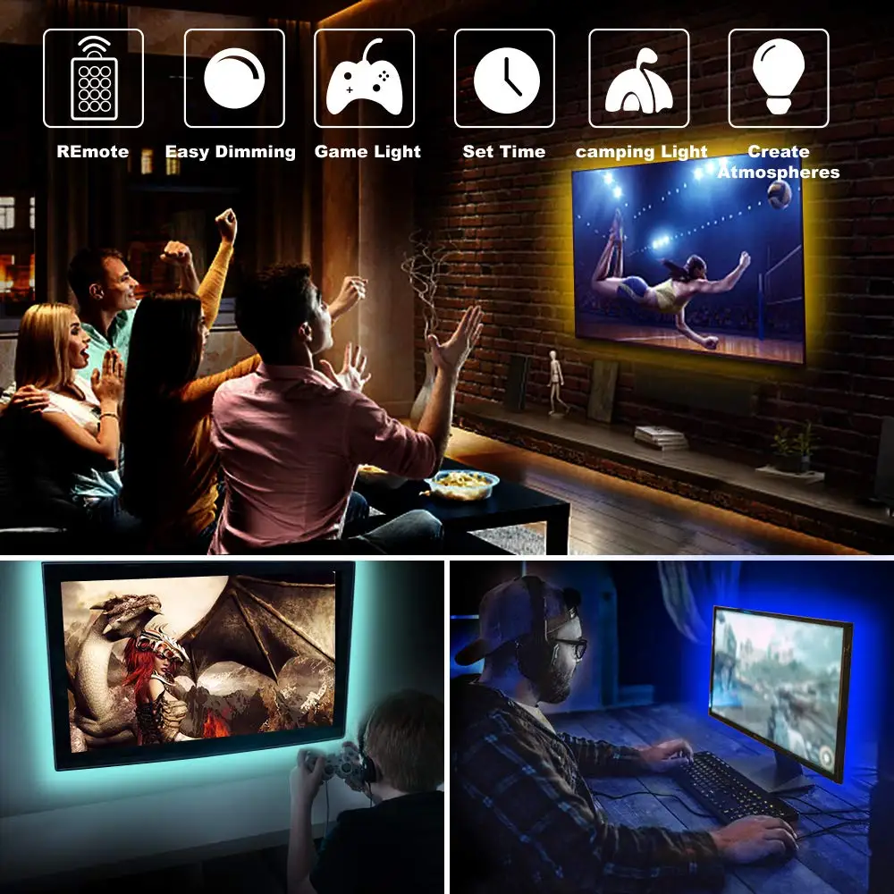 Тип: полоса подсветки USB TV Напряжение: 5 В постоянного тока (источник питания USB) Водонепроницаемый: не водонепроницаемый Тип СВЕТОДИОДА: SMD 5050 Полоса Длина: 50 см/100 см/150 см/200 см Светильник Цвет: разноцветный "Красный-зелёный-желтый (ИК 24Key пульт дистанционного управления) Угол луча: 120 градусов