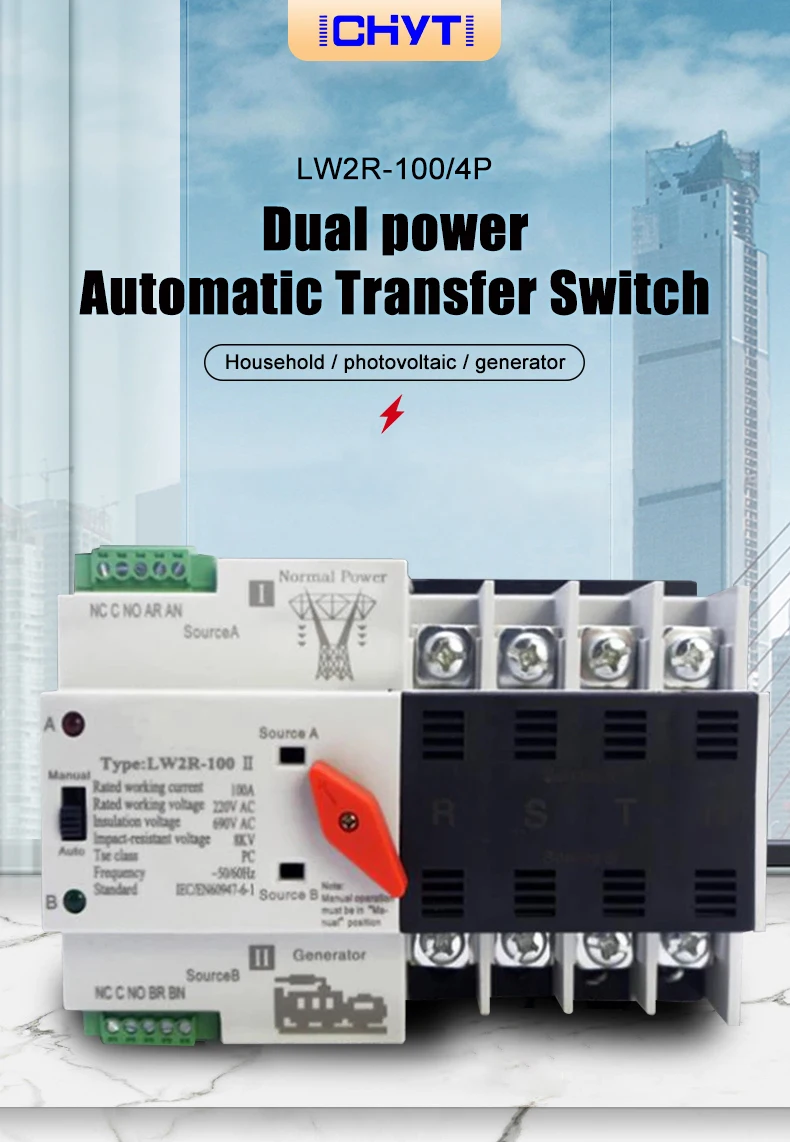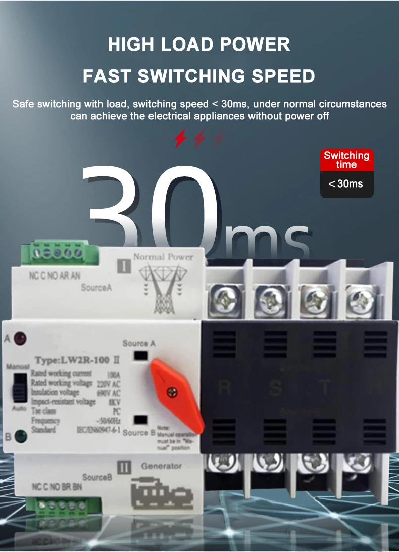 Автоматический переключатель передачи серии W2R подходит для аварийной системы питания с переменным током 50 или 60 Гц номинальным 400 В, 100 А. Он компактен в конструкции, надежен в переноске, удобен в установке и обслуживании и имеет длительный срок службы. Широко используется в различных случаях, когда непрерывный сбой питания не допускается, он может работать как электрически, так и вручную.