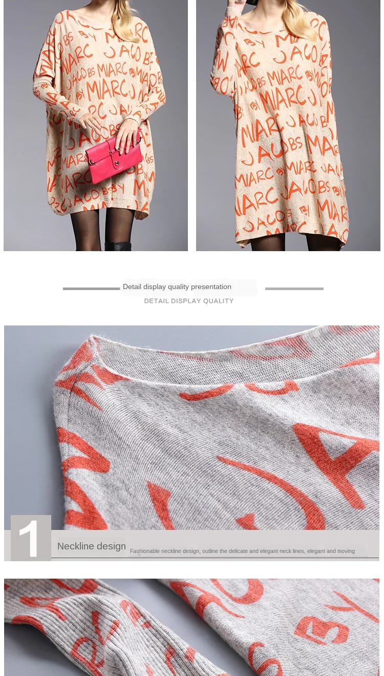 season fat mm large size women's one-line collar long sleeve printing medium and long knitted shirt top
