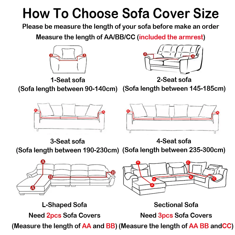 Пожалуйста, тщательно измерьте размер вашего дивана. Также учитывайте подлокотники. Если вы не принимаете подлокотники во внимание, чехол для дивана может не поместиться на вашем диване. 1. Для 1-seat дивана крышка, длина дивана должна быть 90-140 см. 2. Для двухместного дивана длина дивана должна быть 145-185 см. 3. Для 3-seat дивана крышка, длина дивана должна быть 195-230 см. 4. Для 4-х сидений дивана, длина дивана должна быть 235-300 см. 5. Для секционного или углового дивана мы предлагаем приобрести 2 или 3 чехла. Размер чехла будет зависеть от длины линий AA, BB и CC. Например: если AA = 200 см, BB = 160 см, значит, вы должны пойти на 1 предмет 3-если ваш размер дивана и 1 предмет 2-местный диван крышку. 6. Размер наволочки 45*45 см (для каждого купленного чехла для дивана будет выдан наволочка того же типа). 7. Если у вас все еще есть вопросы о размере чехла для дивана, пожалуйста, свяжитесь с нами.
