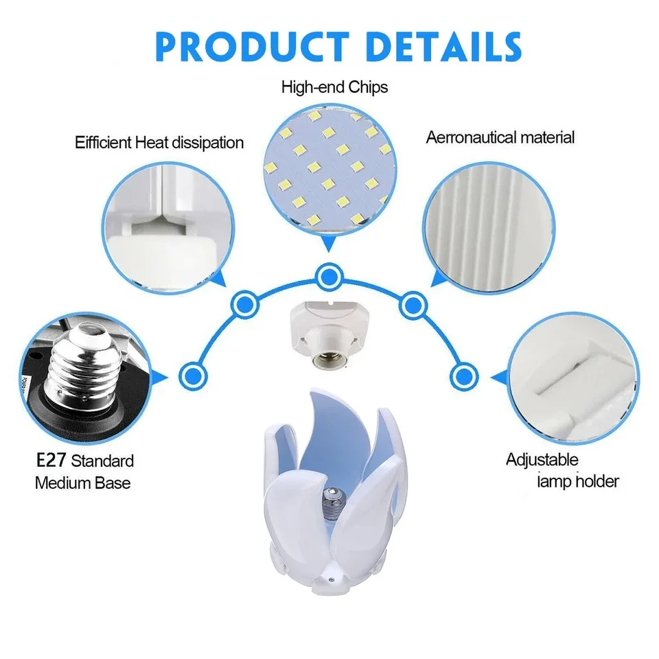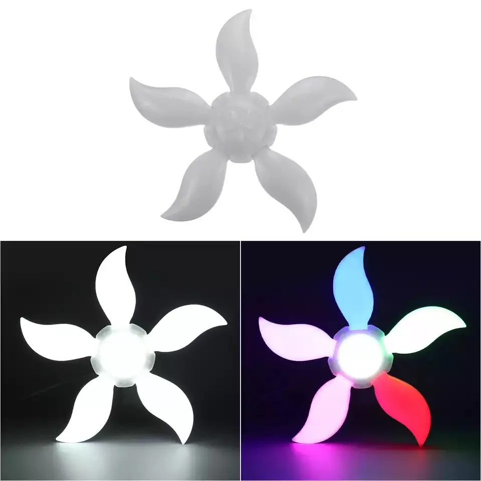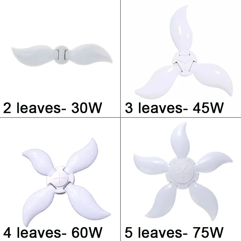 -Материал: ПК -Тип цоколя: E27 -Количество лампочек: 140 светодиодов -Светодиодный чип: 2835 -Напряжение: 220 В переменного тока/85-265 в -Мощность: 30 Вт/45 Вт/60 Вт/75 Вт -Цветовая погрешность: 6500K -Световой поток: 4800LM -Размер: 2/3/4/5 Листья -Регулируемый угол: 90 °