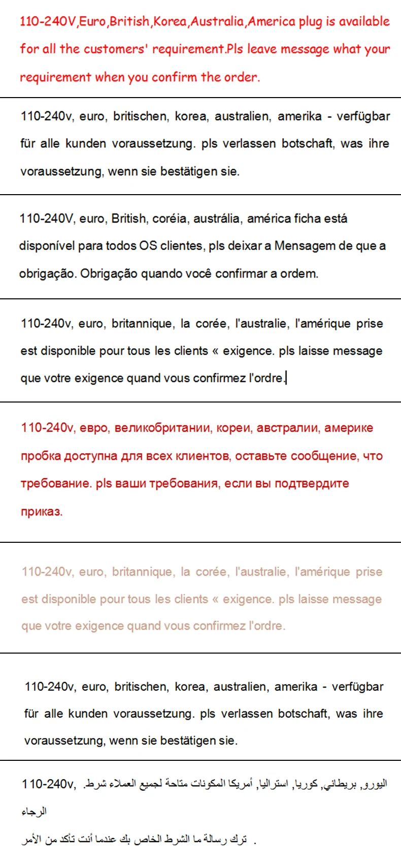 ● Please make sure that the color and model of the product are what you want to buy. ● Please confirm the voltage and plug of the product. ● Finally, please attach important information about product color, plug and voltage to the order Remarks. ● Please take a close look to see if it uses USB for charging or electricity. At the same time, we can also tell you your requirements through online chat, so that we can see and arrange delivery for you as soon as possible.