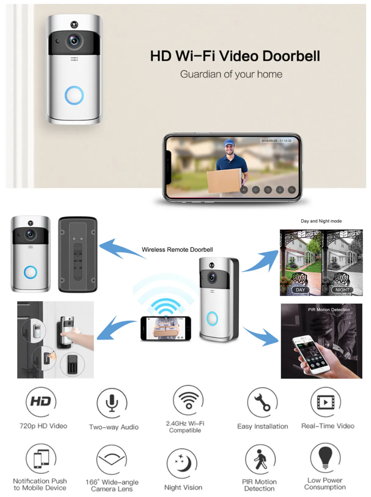 1. Три аккумулятора 18650. 2. Миллион HD пикселей с широкоугольным объективом 166 градусов 3. Поддерживает мобильный телефон, удаленное устройство быстрого пробуждения в течение 1 секунды. 4.2.4G Wi-Fi соединение 5. Высококачественный двусторонний разговор с шумоподавлением 6. Поддержка обнаружения движения PIR, когда кто-то поднимается у двери, немедленно Оповещает push-уведомления на мобильный телефон. 7. Дневной и ночной режим автоматического переключения, будь то день или ночь, изображение Хорошо видно, для вашей безопасности и безопасности семьи