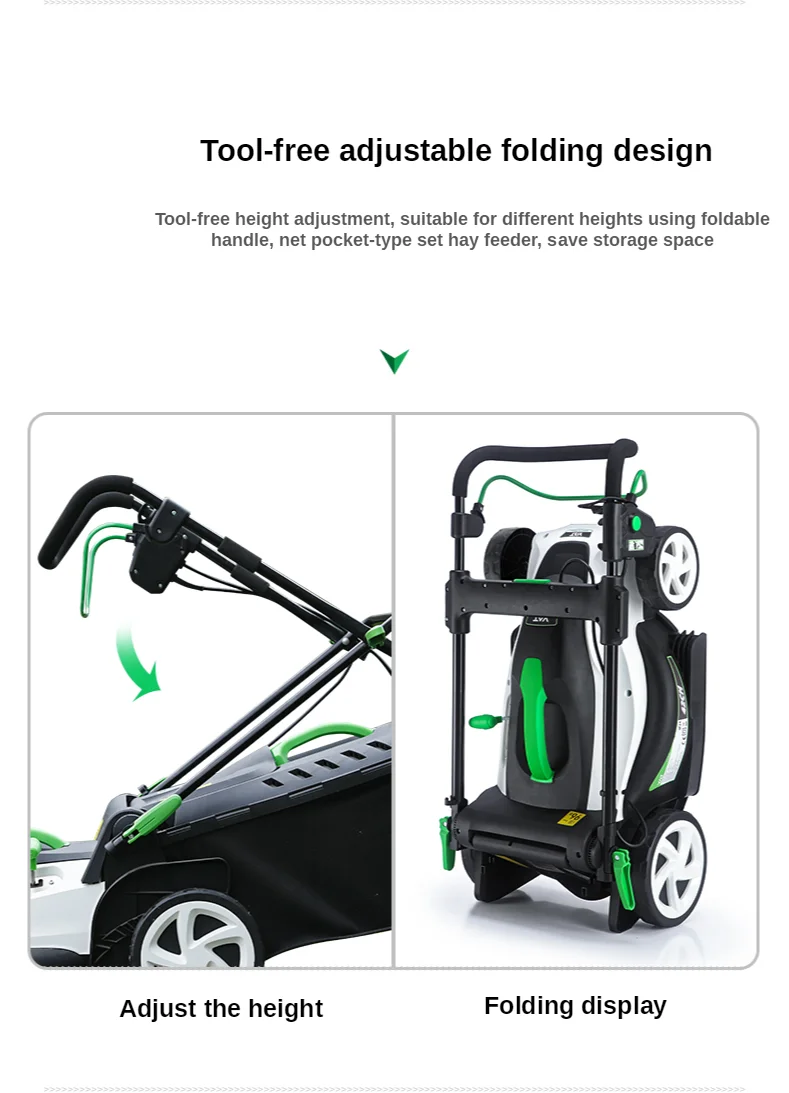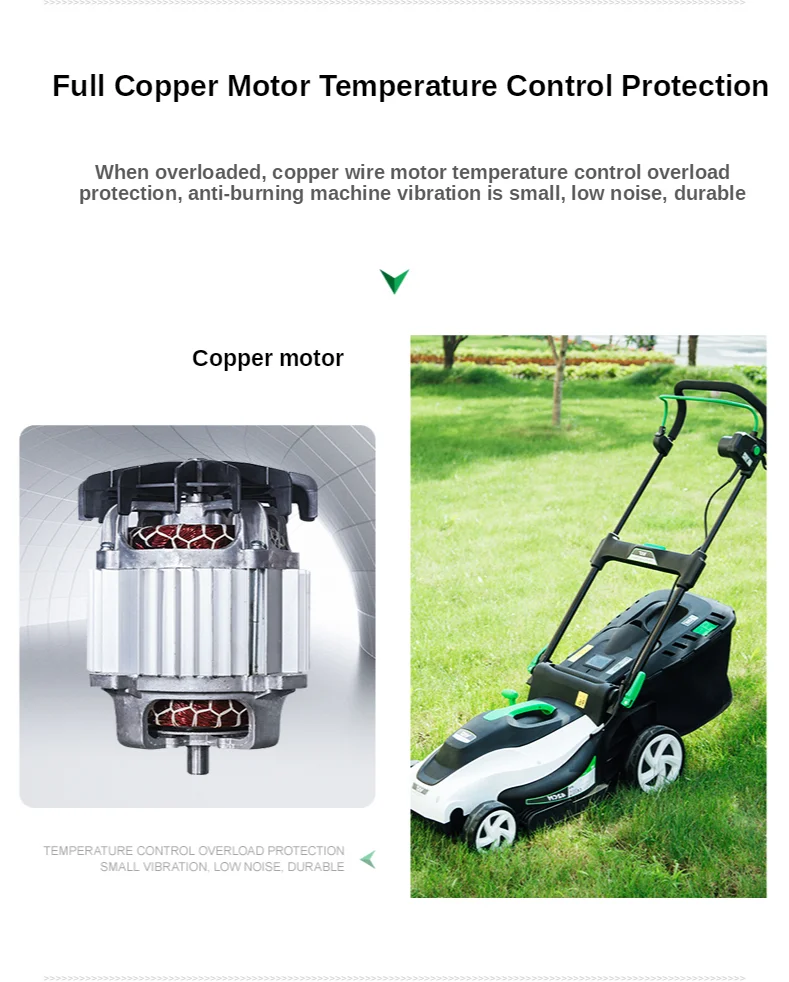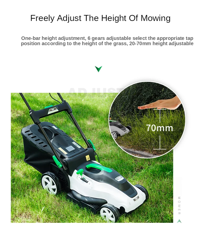 Мощность: 1800 Вт Регулировка шестерни: 6 передач Тип двигателя: мотор из медной проволоки Высота удержания травы: 20-70 мм Напряжение: 220 В Высота скашивания: ниже 40 см Емкость коробки для травы: 50 л Вес: 13 кг