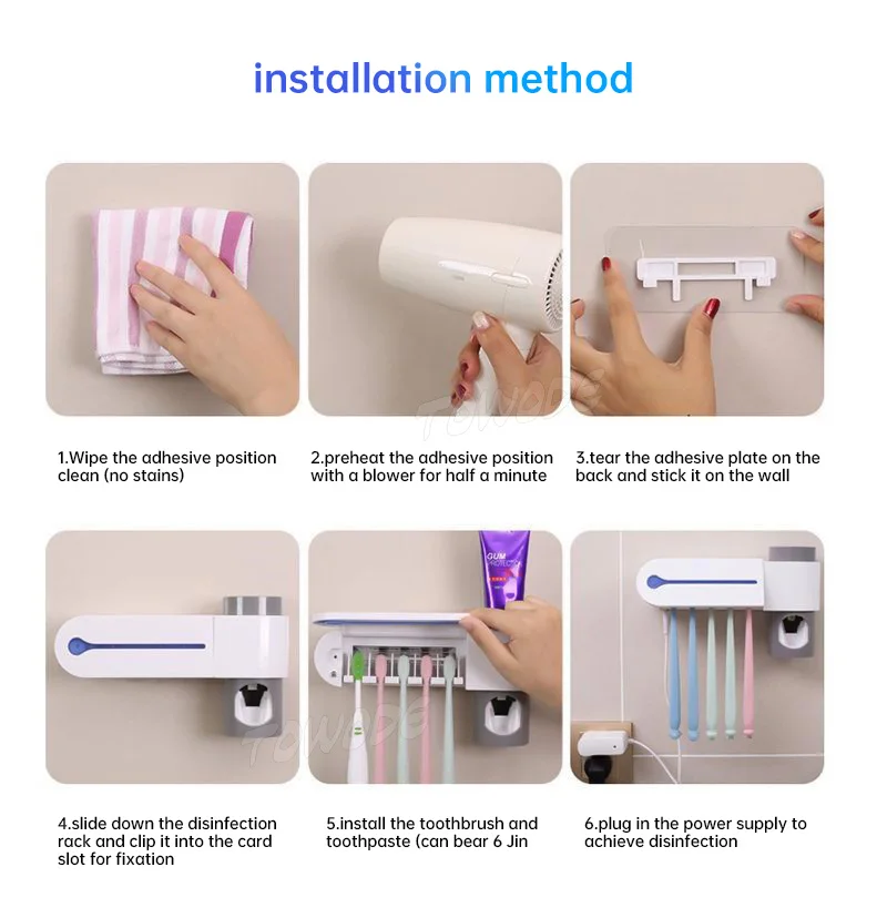 1. Семейный дизайн может хранить до пяти зубных щеток. Храните зубную щетку с интервалами, более гигиенично и безопасно 2. Зубная паста стойка и настенный висячий может сэкономить место 3. Автоматический Дозатор зубной пасты: аккуратный, без отходов 4. Разъем USB: Улучшенный водонепроницаемый дизайн подходит для ванной комнаты, чтобы обеспечить вашу безопасность 5. Совместим с любой зубной пастой 6. Изготовлен из нового АБС-пластика, нетоксичный, безвредный и экологически чистый