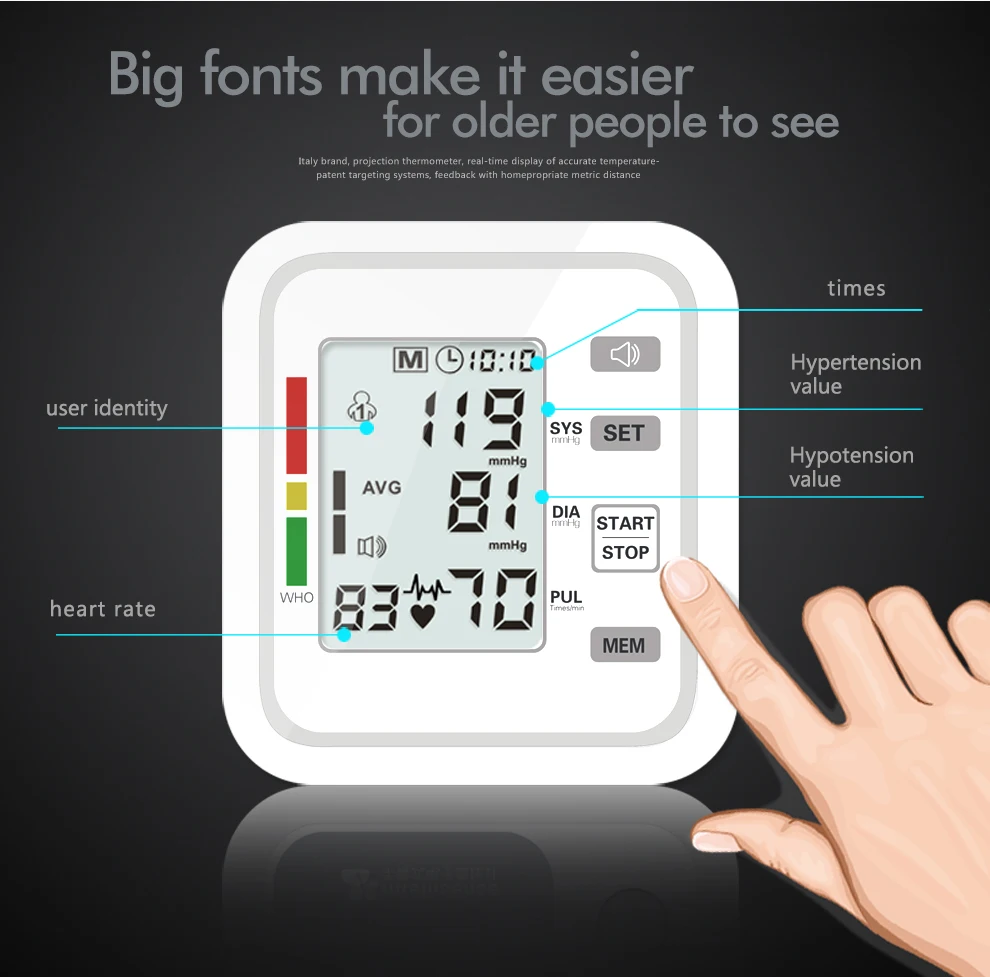 1. Измерение одной кнопкой 2. Память 99 единиц памяти для каждой группы. Отображение трех последних средних измерений. 3. Запрос данных памяти в последовательности 4. ЖК-дисплей HD: данные дисплея четко видны. 5. Операция автоматически выключается в течение 1 минуты без операции 6. Точность измерения артериального давления: простая быстрая и точная. 7. Аритмия сердечного ритма дает эффективное предупреждение о проблемах с сердцем. 8. Маленький, легко носить с собой. 9. Два способа питания: DC6V или 1,5 V * 4 AAA батареи (не входят в комплект)