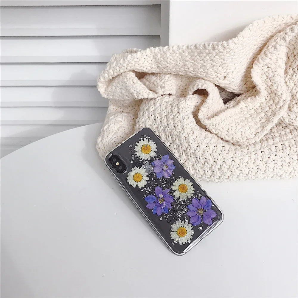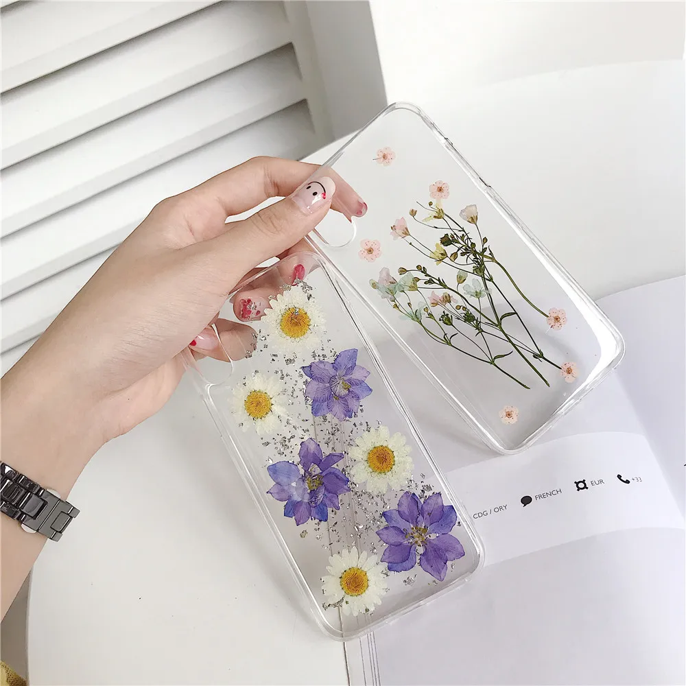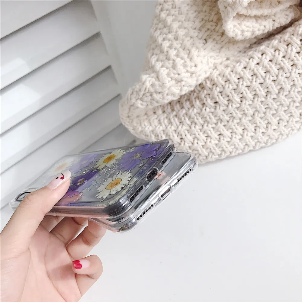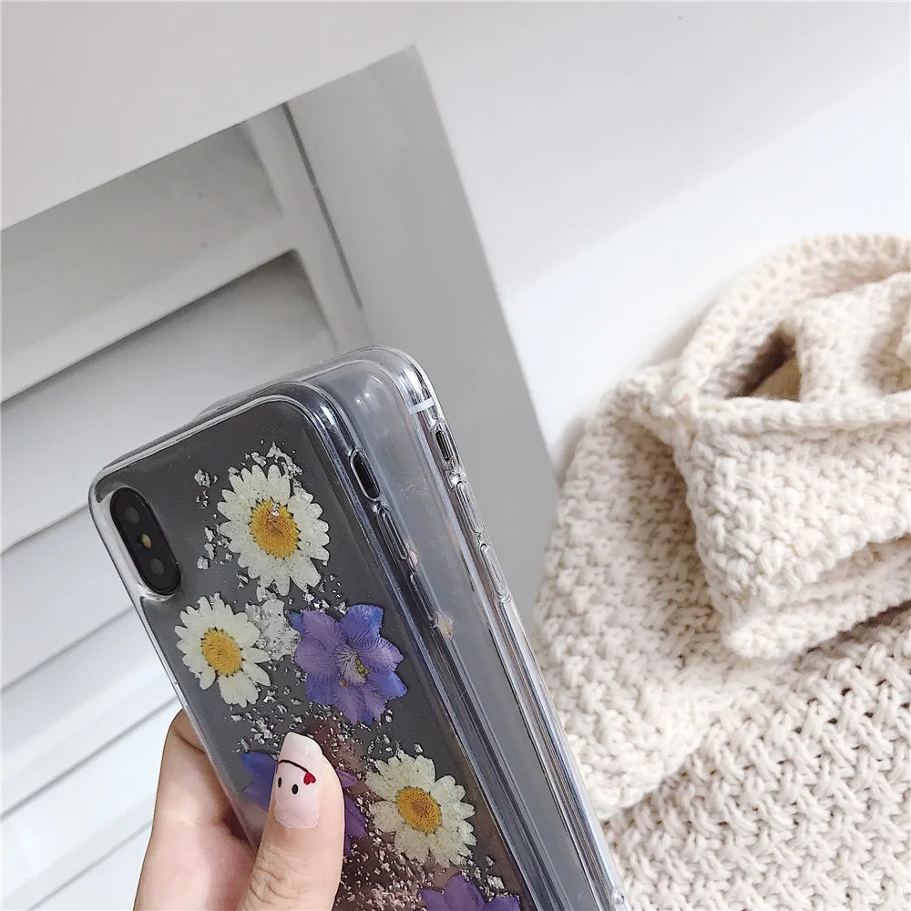 Daisy Sequins Real Dried Flower Soft TPU Phone Case For iPhone 11 Pro Xs MAX XR X 6 s 7 8 Plus SE 2 Girl Gift Clear Back Cover