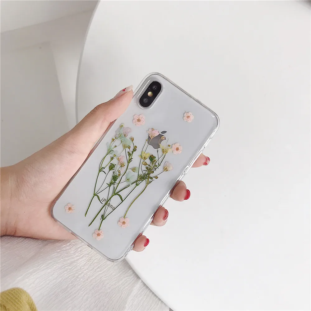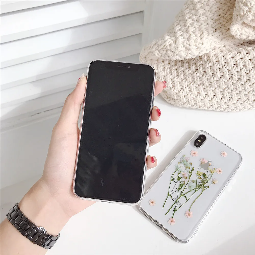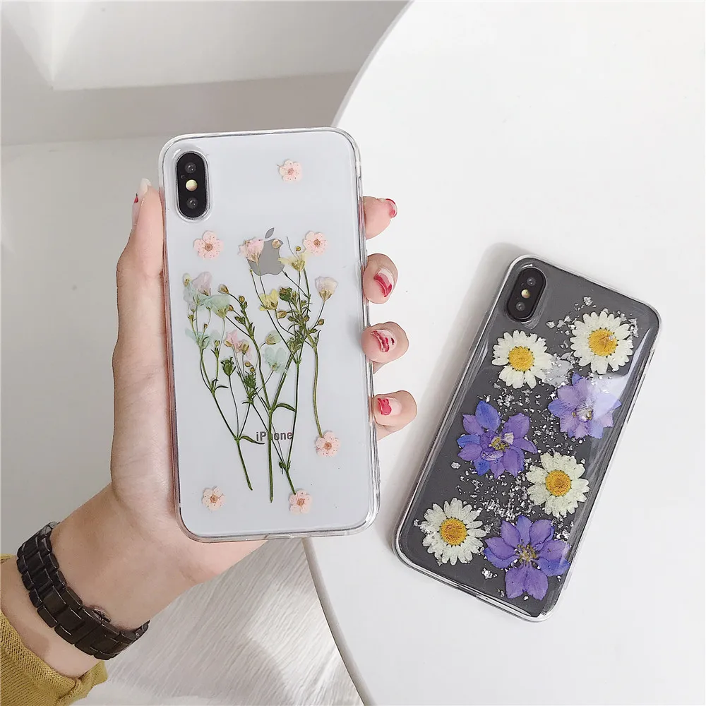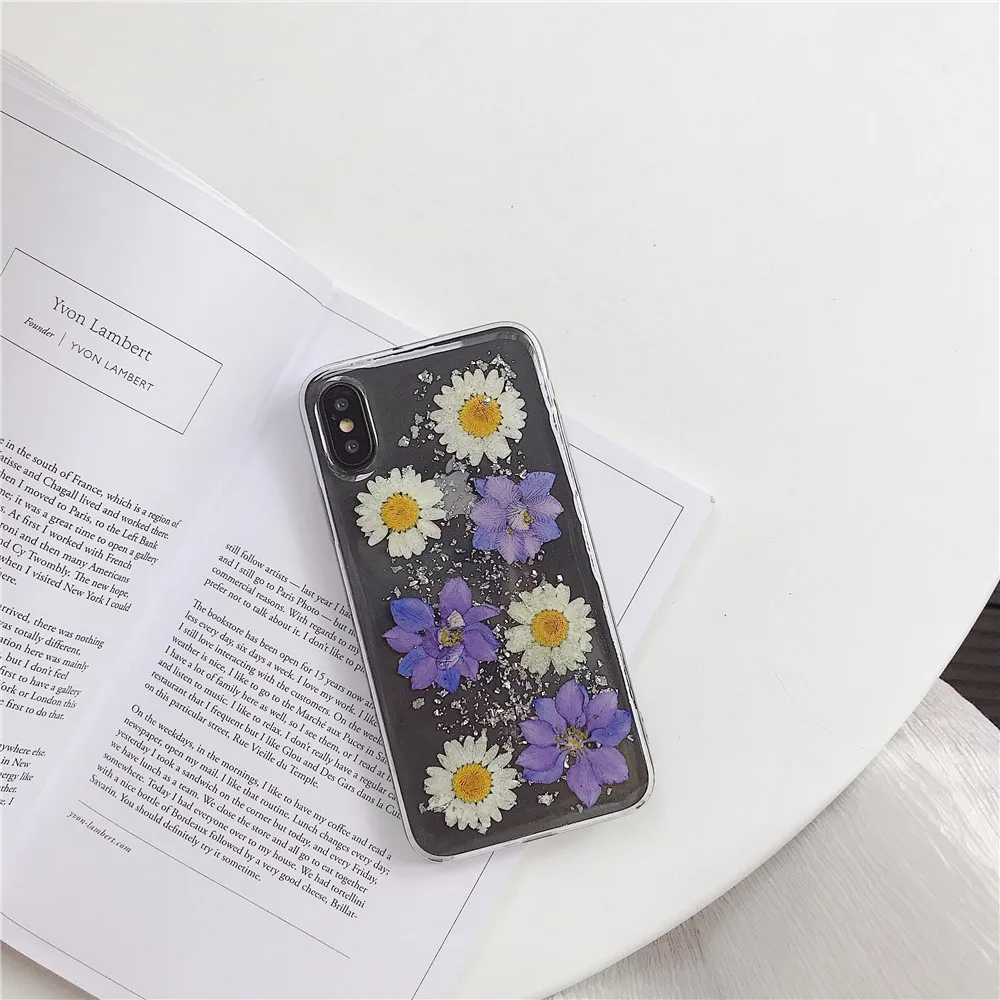 Daisy Sequins Real Dried Flower Soft TPU Phone Case For iPhone 11 Pro Xs MAX XR X 6 s 7 8 Plus SE 2 Girl Gift Clear Back Cover