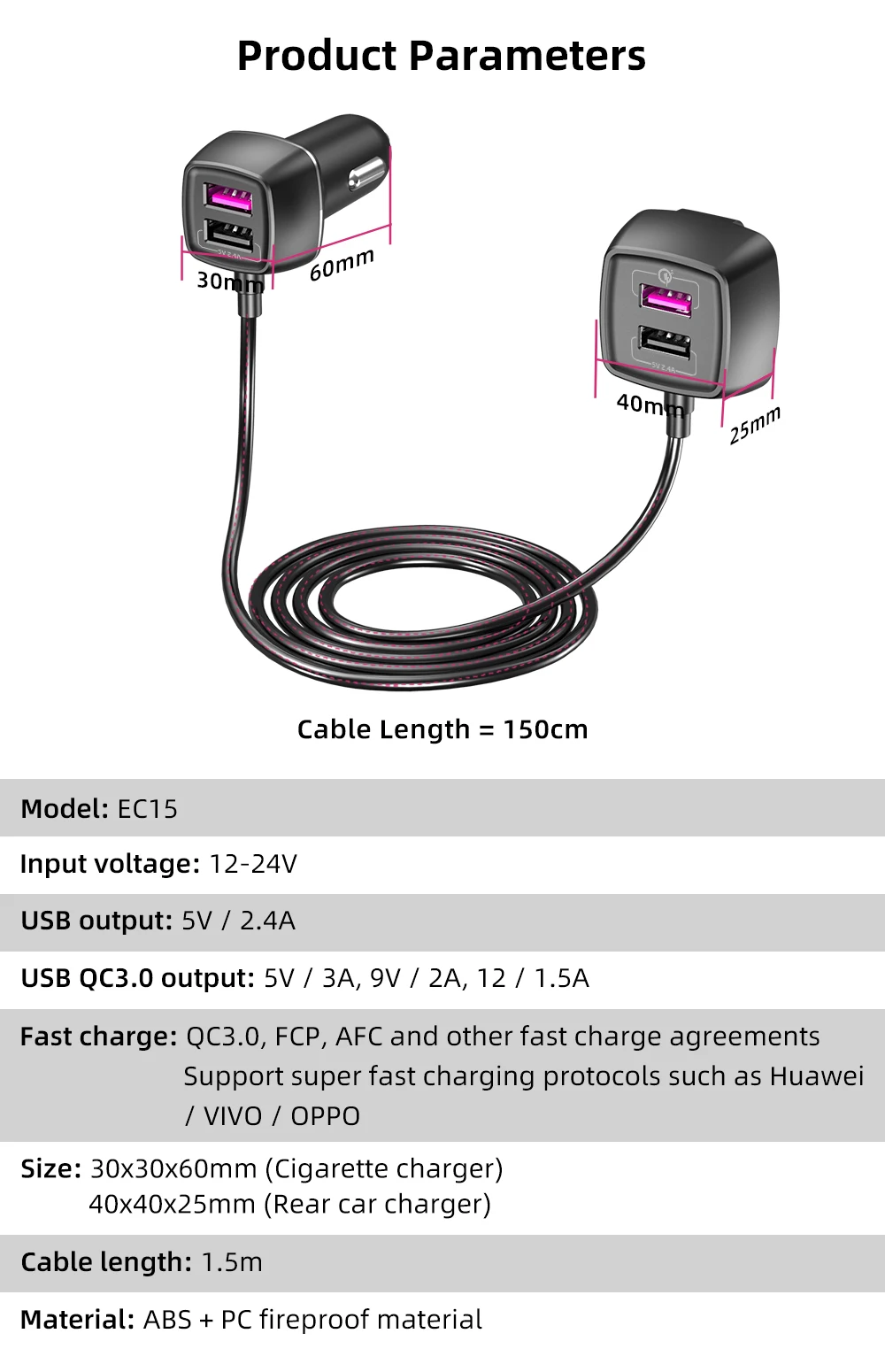 Особенности •4 порта USB, можно заряжать 4 устройства одновременно •QC 3,0 USB быстрая зарядка, максимальный выход 18 Вт Удобный •Дизайн задних зажимов, легко фиксируется •Индикатор портов USB, легко подключается и заряжается ночью •1,5 м длина кабеля, оба передних и задних сидений может быть предъявлено обвинение Безопасность •Интеллектуальная Зарядка, регулируйте зарядный ток в соответствии с различными устройствами • Защита 5, ① Защита от перенапряжения, ② защита от перегрузки, ③ защита от перегрузки, ④ защита от перегрева, ⑤ противопожарная защита Описание продукции • Модель: Коллиматорный прицел с EC15 •Входное напряжение: 12-24 В
