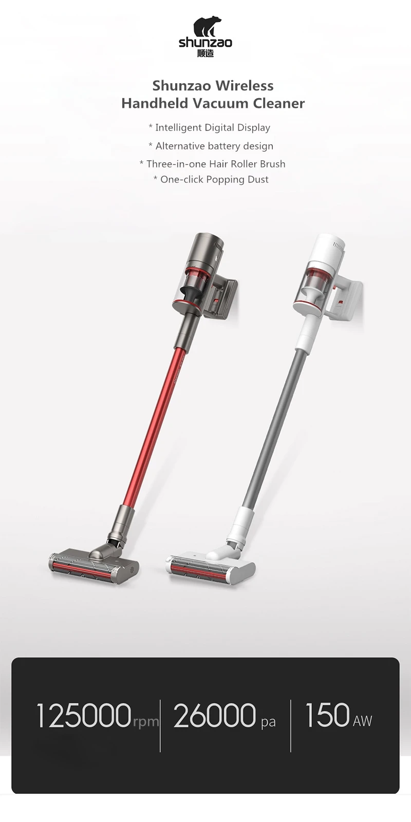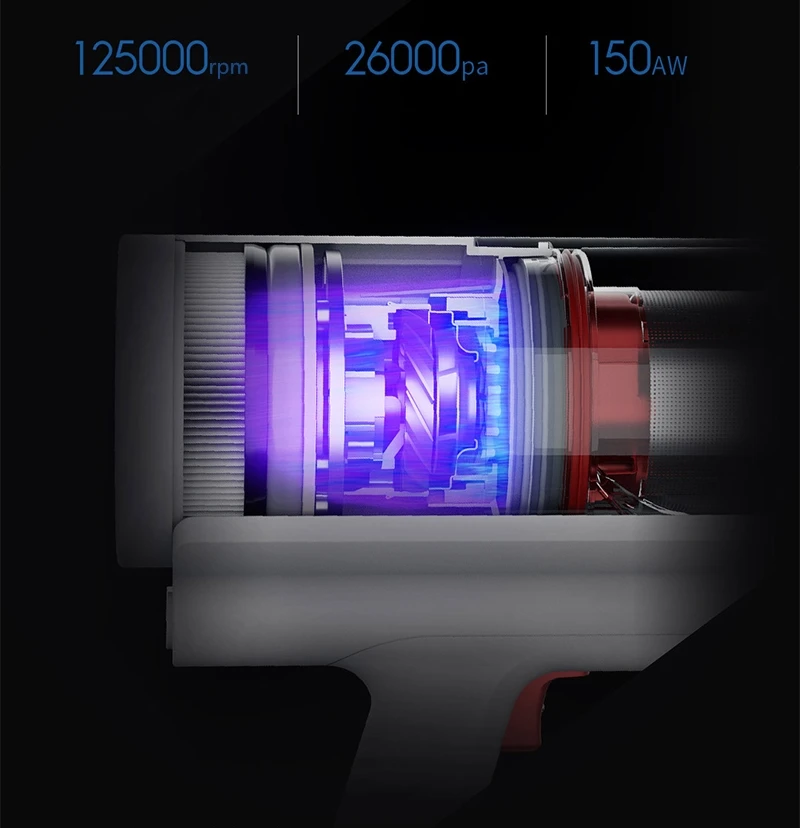 150AW супер всасывание, Более Тщательная Очистка Shunzo самостоятельно разработала трехфазный бесщеточный двигатель с мощностью до 125000 об/мин. Отличная производительность приносит супер всасывание 150AW, и он легко высасывает глубокие пятна, не оставляя негде спрятать пыль.