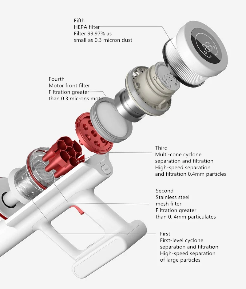 Пятиступенчатая фильтрация HEPA для восстановления вторичного загрязнения Пяти этапах HEPA фильтрации задерживает пыль, как малых по мере того как 0,3 микрона и 99.99% аллергенов. Всасывание в мусорное ведро, не входя в двигатель пылесоса, также может избежать вторичного загрязнения во время следующего использования.