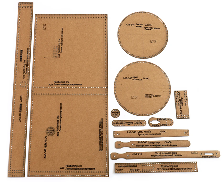 * Finished style: Drum bag * Finished product size: 12.5CM*18CM * Reference:D ring, hanging buckle * Material Description: About 2-3 feet (for reference only) * Template material: Kraft paper,Acrylic * Color: (as pictures show) * Acrylic and Kraft Paper templates are great for the leather handcrafts lovers. * Ideal tool for making simple leather bag. ----- This item just a Acrylic and Kraft Paper Tool,not the leather Finished product.