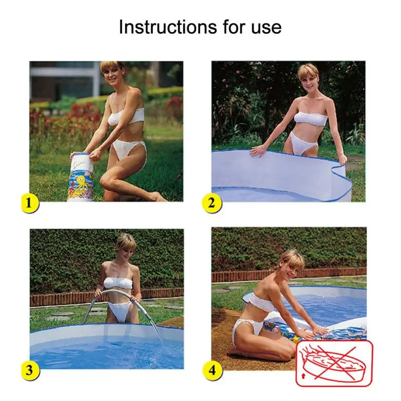2. Перед заполнением воды, пожалуйста, поместите ребенка на ровную поверхность без грубых предметов, нажмите на дно бассейна полностью в круг, а затем установите стену бассейна, чтобы начать наполнение.