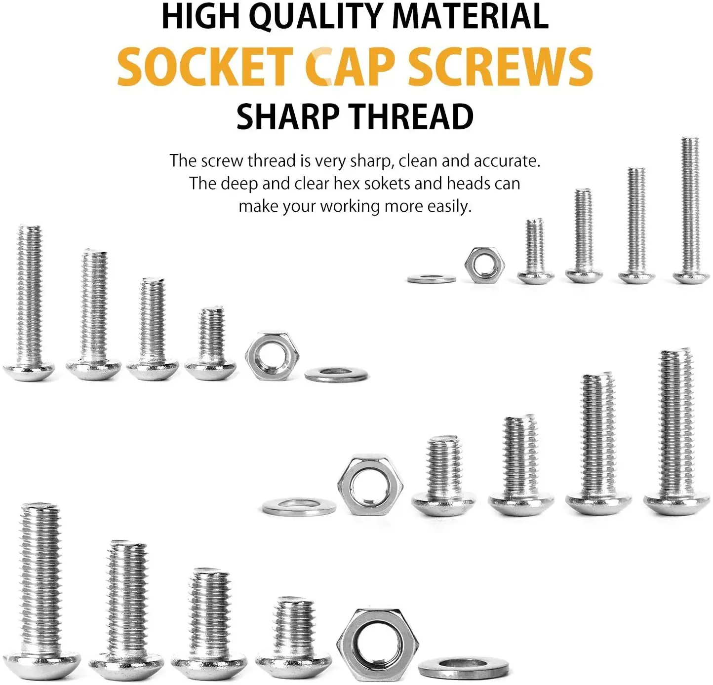 √ Высокое качество 304 нержавеющая сталь Шестигранная головка колпачок винты болты гайки плоские шайбы комплект. Мы также предоставляем три бесплатных релевантных ключа в наших комплектах. √ Гайки и плоские шайбы расширяют площадь контакта и уменьшают давление, чтобы защитить винты и детали. √ Множество различных размеров винтов M3 M4 M5 (Тип привода: Шестигранная розетка; Тип головки: головка кнопки) с подходящими гайками и плоскими шайбами отвечают требованиям разных людей, О необходимости вашей домашней жизни. Все очень организованное и достойное в прочный удобный чехол, можно использовать для хранения коробки, Для вас, очень легко открыть и закрыть. √ Не только он изготовлен из высококачественных элементов, этот комплект также способствует защите окружающей среды и гарантированно не содержит ртуть и не токсичен, как правило, не содержит яд. Этот набор может быть широко использован во всех видах точного оборудования, секретных инструментов, инструментов, электронных продуктов, бытовой техники, средств связи, замков, ламп, ламп, игрушек и т. д. Made изготовлен из высококачественной нержавеющей стали 304, известной своей надежной и жесткой прочностью, а также ее коррозионно-стойким качеством. Конструкция резьбы на поверхности винта, этот тип стали способен выдерживать резкие погодные и температурные изменения, включая размещение в чрезвычайно влажных областях. Эти качества гарантируют износостойкость этих винтов и гаек, которые практически не поддаются разрушению. ➤Два типа на выбор: винты с шестигранной головкой и гайки, наиболее часто используемые в механической промышленности, с отличной структурой и высокой прочностью. Обычно используется для крепления деталей с зенками. ➤Мы также предоставляем бесплатные соответствующие ключи в наших комплектах. 1. Простой и легкий. 2. Шесть контактных поверхностей между шестигранным винтом и гаечным ключом. 3. Достаточно и не легко повредить. 4. Может использоваться для завинчивания глубоких отверстий. 5. Можно использовать для завинчивания очень маленьких винтов. 6. Можно использовать оба конца гаечного ключа. Serves служит широким спектром использования и назначения от ремонта мебели и сантехники до деревянных работ и других проектов DIY. Идеально подходит для использования различными работниками и ремонтниками от сантехников до монтажников как профессиональных, так и любительских, даже дийеры могут выбрать его использование. Density Плотность: 7,93 г/см ^ 3 термостойкая до 800 градусов Цельсия, также хорошая ржавчина и высокое качество прочности. ➤Спецификация: 1. Тип винтов: винты с шестигранной головкой. 2. Размер: M3 M4 M5. 3. Материал: нержавеющая сталь 304. 4. Тип привода: Шестигранная розетка; Тип головки: кнопочная головка ➤Все очень организованное и достойное в чехол. Чехол очень легко открывается и закрывается ➤Этот набор идеально подходит для использования автомехаников, плотников, строительного персонала, электриков, оператора тяжелого оборудования, машиниста, технического обслуживания, сварщиков, сборщиков или тех, кто постоянно требует требовательного решения для разрешения, ремонта и/или строительства конкретной машины, транспортного средства, мебели и/или оборудования, которое может выдерживать использование износа. ➤Содержимое упаковки: Три бесплатные шестигранные ключ