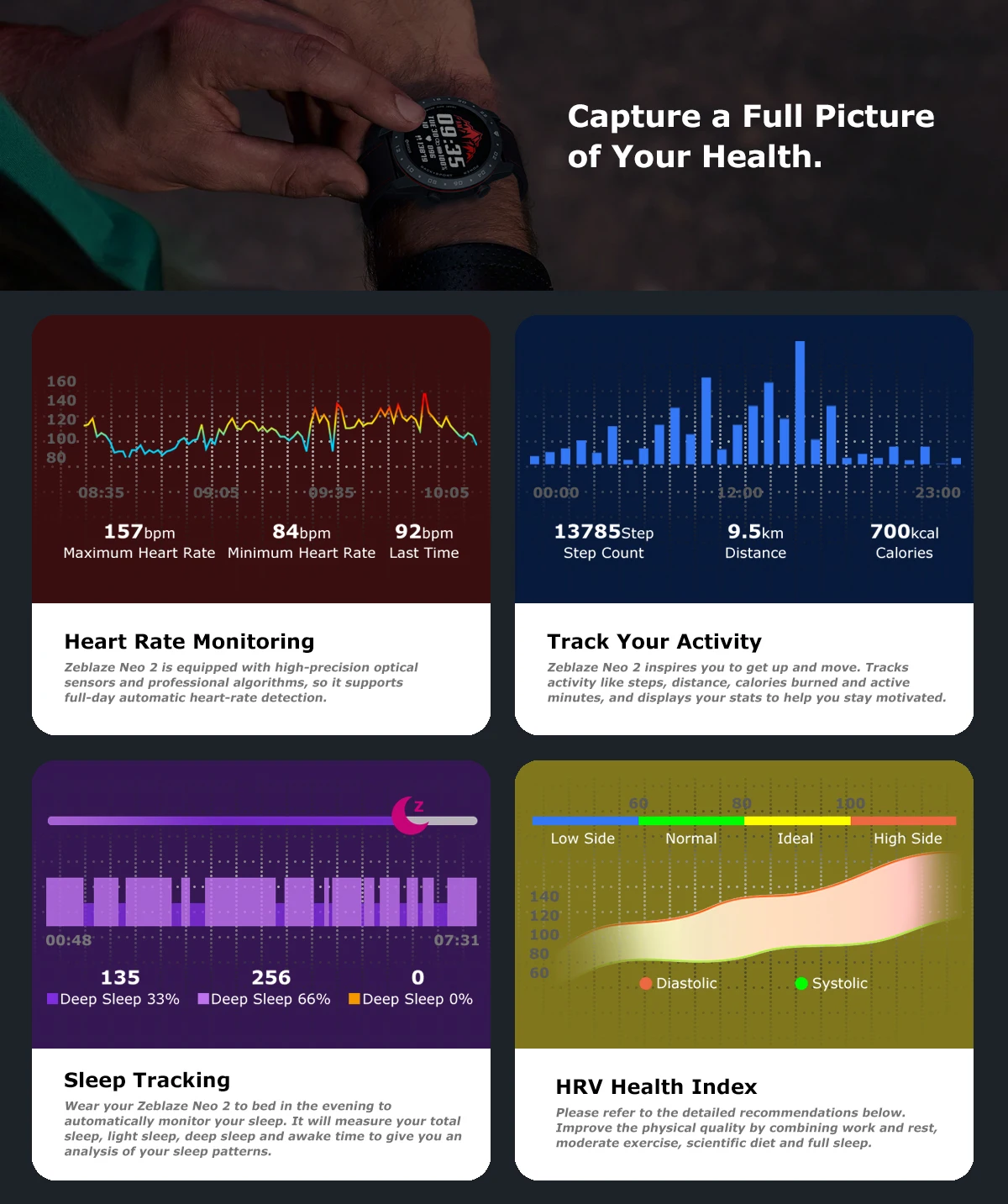 Мониторинг частоты сердечных сокращений Zeblaze NEO 2 оснащен высокоточными оптическими датчиками и профессиональными алгоритмами, поэтому поддерживает автоматическое определение частоты сердечных сокращений в течение всего дня. Следить за своей активностью Zeblaze NEO 2 вдохновляет вас встать и двигаться. Отслеживает такие действия, как шаги, расстояние, сожженные калории и активные минуты, и отображает вашу статистику, чтобы помочь вам оставаться мотивированными. Отслеживание сна Наденьте Zeblaze NEO 2 на кровать в вечернее время, чтобы автоматически следить за вашим сном. Он измерит ваш полный сон, светильник, глубокий сон и время бодрствования, чтобы дать вам анализ ваших моделей сна. Вариабельности сердечного ритма индекс здоровья Пожалуйста, обратитесь к детальным рекомендациям ниже. Улучшите физическое качество, сочетая работу и отдых, умеренные физические упражнения, научную диету и полный сон.